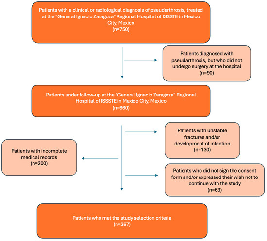 The main factors that condition the appearance of pseudoarthrosis have been identified as sex, smoking, age, race, nutrition, diabetes mellitus, infection, and obesity [3,4,5]. In addition, decalcifying osteopathy, as well as the type of fracture, are factors related to treatment, as insufficient reduction can condition this pathology [6,7,8]. However, in Mexico, the clinical and sociodemographic context in which pseudoarthrosis occurs is still unknown.
