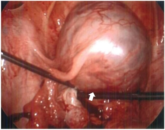 Intraoperative photo taken during diagnostic laparoscopy demonstrating intact gestational sac within dilated portion of left fallopian tube. The gestational sac (arrow) is located primarily within the interstitial portion of the fallopian tube with no involvement of the distal end. There is increased musculature surrounding the fallopian tube which may represent extended myometrium from the uterine cornua.