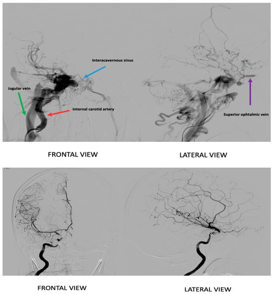 The day after the diagnosis, our patient underwent therapeutic arteriography and was successfully treated with transvenous coil embolization, achieving complete closure of the CCF without complications. She was discharged after 24 h.