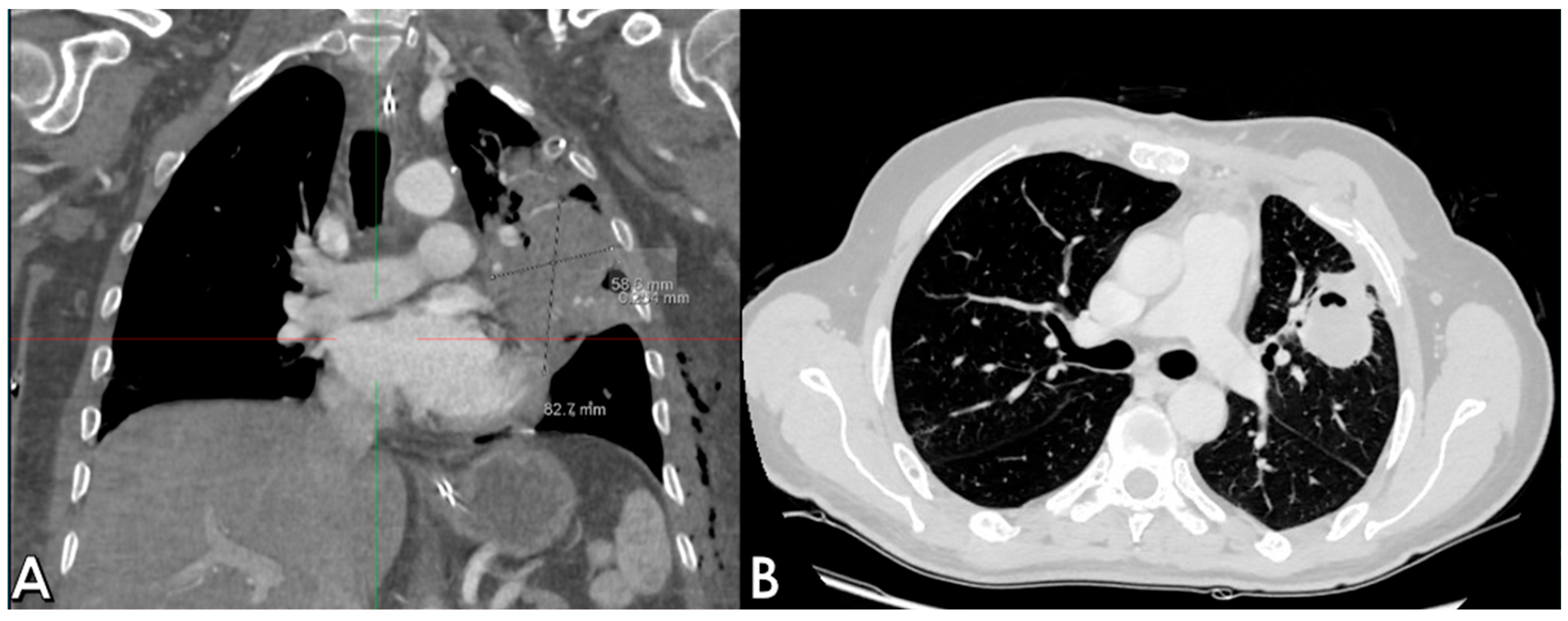 The postoperative course took place in the Intensive Care unit for nine days, during which the patient received blood transfusions (2 units), vasopressor support, antibiotic therapy and steroids. Bronchial toilet was performed twice to free of blood and secretions the tracheobronchial tree. Due to the occurrence of a fever and a rise in the inflammation markers a CT scan was ordered on p.o. day 3, showing an intraparenchymal hematoma (6 cm) in the left upper lobe (LUL), without active bleeding spots (