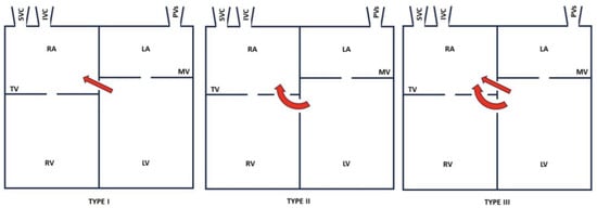 Anatomically, this may be above (type I), or below the tricuspid valve (type II) or both (type III), as shown in Figure 3 [4,10]. In the latter two cases, a PMVSD often exists in the tricuspid valve septal leaflet. The tricuspid valve may be abnormal (cleft, widened commissural space, or perforated) [11,12]. An abnormal case of tricuspid chordae causing regurgitation has also been reported [13].