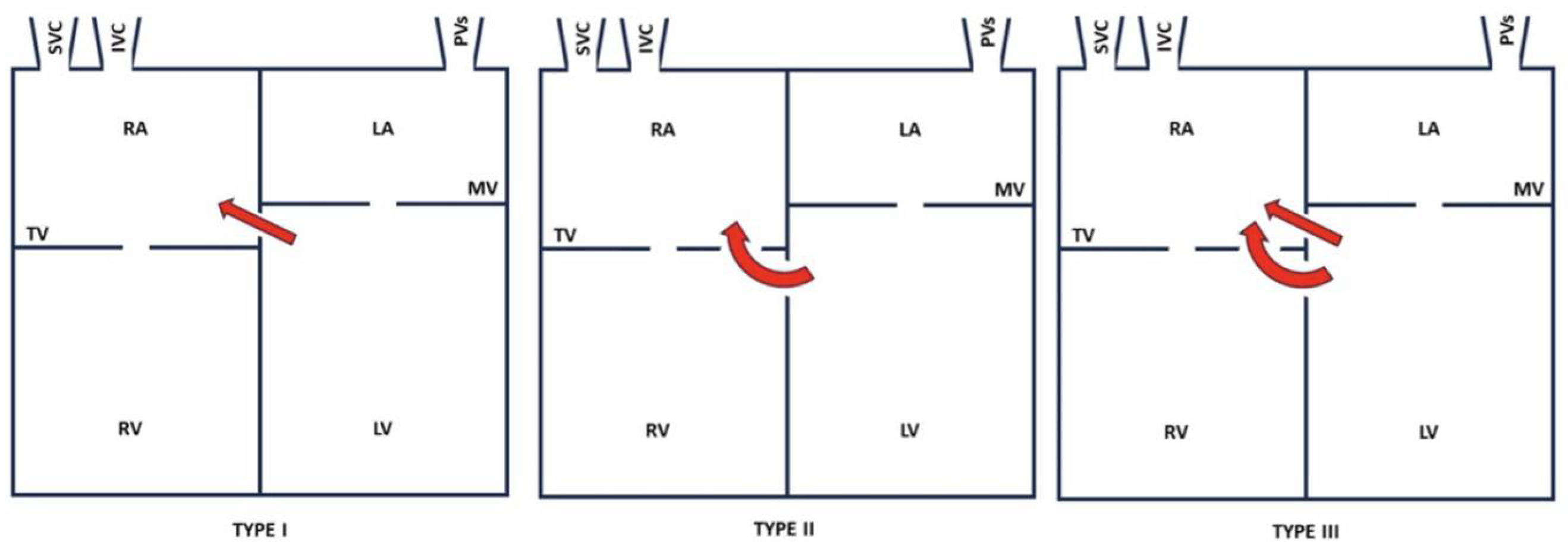 Anatomically, this may be above (type I), or below the tricuspid valve (type II) or both (type III), as shown in