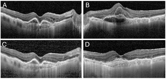 OCT images from both presentation of the patient to the ER prior to aflibercept 8 mg injections and post treatment. The first images demonstrate intra-retinal fluid and pigment epithelial detachments (PEDs) in her right eye (A), and sub-macular hemorrhage with subretinal fluid in her left eye (B). Images (C,D) show clearance of the vitreous haze in both eyes under topical treatment, with resolution of the intraretinal fluid and partial absorption of the hemorrhage in the right and left eye, respectively.