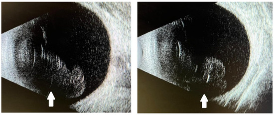 B-scan ultrasonography of both eyes showing attached retinas and symmetrical vitreous opacities (white arrows) consistent with intraocular inflammation.