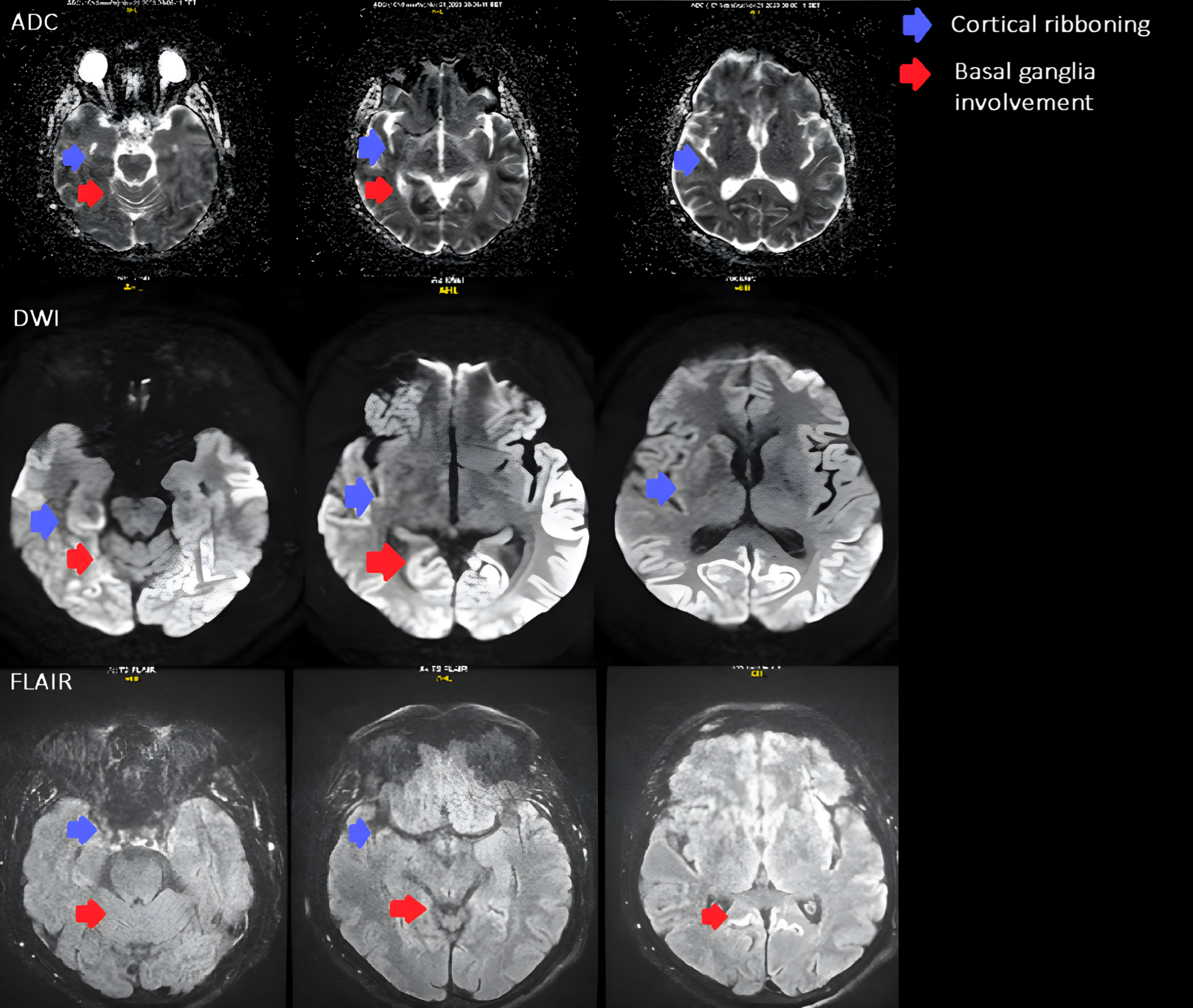 MRI revealed diffusion restriction in the cerebral cortex, predominantly in the parietal, occipital lobes, and cingulate gyrus, with lesser involvement in the fronto-temporal lobe, right caudate nucleus, and anterior putamen. Additionally, there were signs of previous microhemorrhages in the temporo-parietal areas, indicated by hemosiderin deposits.