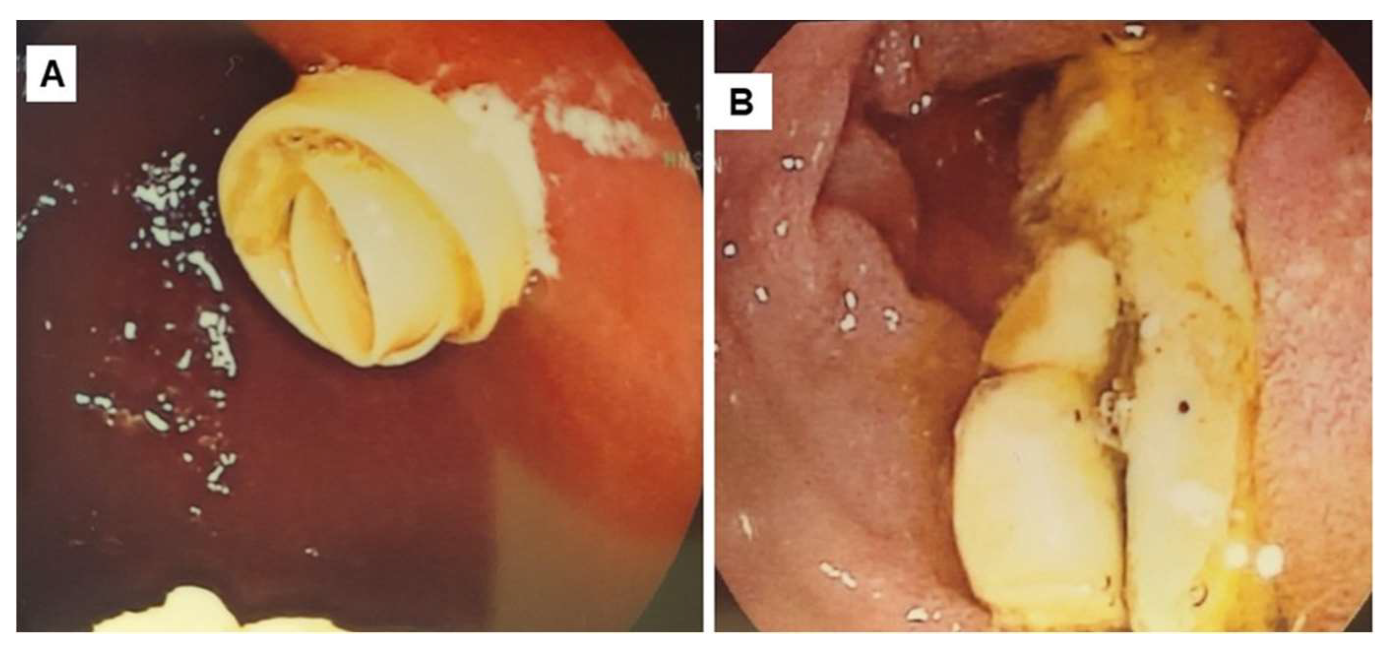 - Wang, X.; Liu, H.; Ye, G.; Lv, Z.; Hu, Z. Successful management of membranous duodenal stenosis by endoscopic balloon dilation and membrane resection with an insulated-tip knife. Endoscopy 2022, 54, E256–E258. [Google Scholar] [CrossRef] [PubMed]