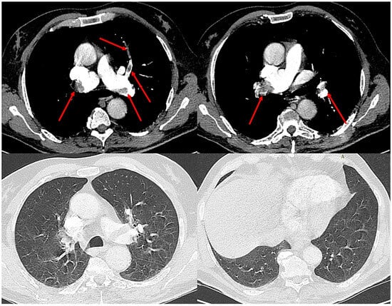 Computed tomography pulmonary angiography demonstrating extensive bilateral central pulmonary emboli (red arrows) involving both main pulmonary arteries and segmental branches. The lung parenchyma appears normal, without evidence of consolidation, ground-glass opacities, or atelectasis, confirming that the severe hypoxemia was not attributable to parenchymal disease.