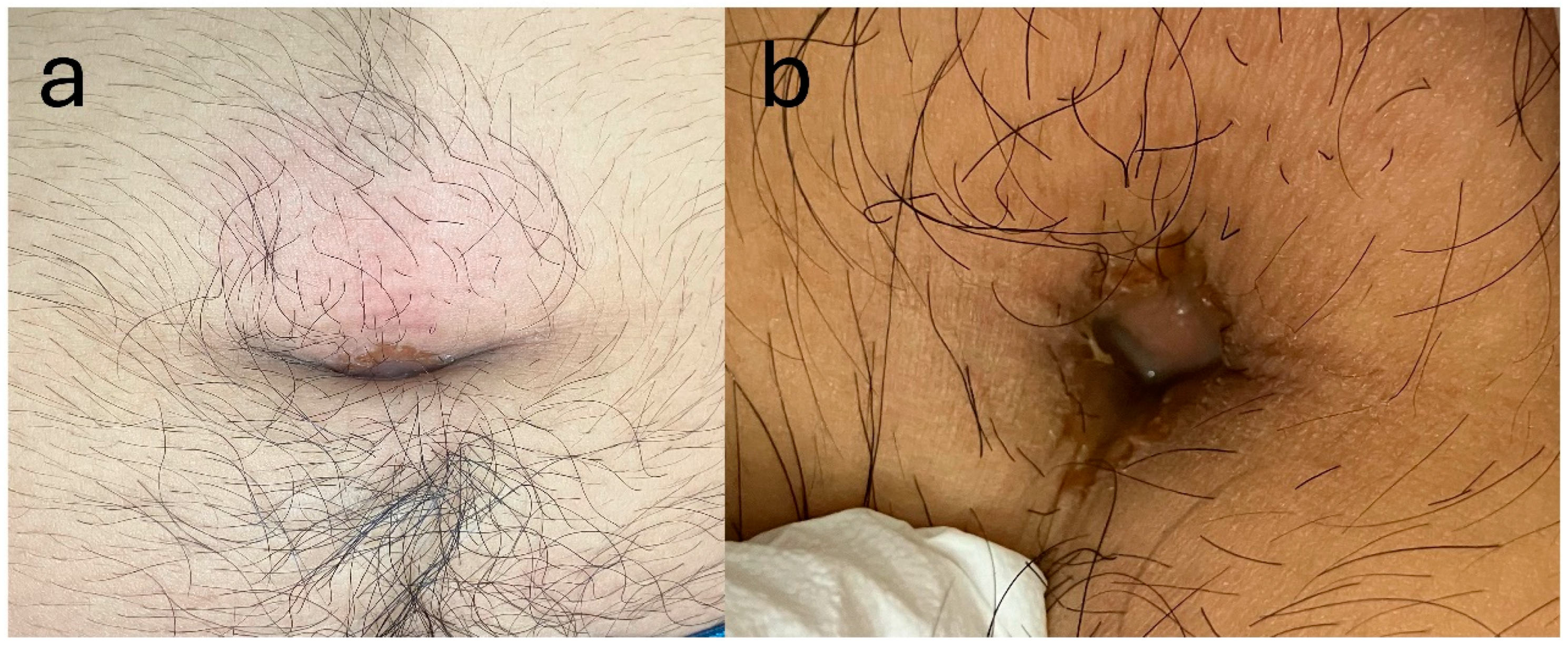 At the initial visit, a swab sample was obtained from the purulent discharge at the umbilicus for bacterial culture. The culture yielded Bacteroides ovatus and Anaerococcus vaginalis, with semiquantitative assessments of 1+ and 2+, respectively.