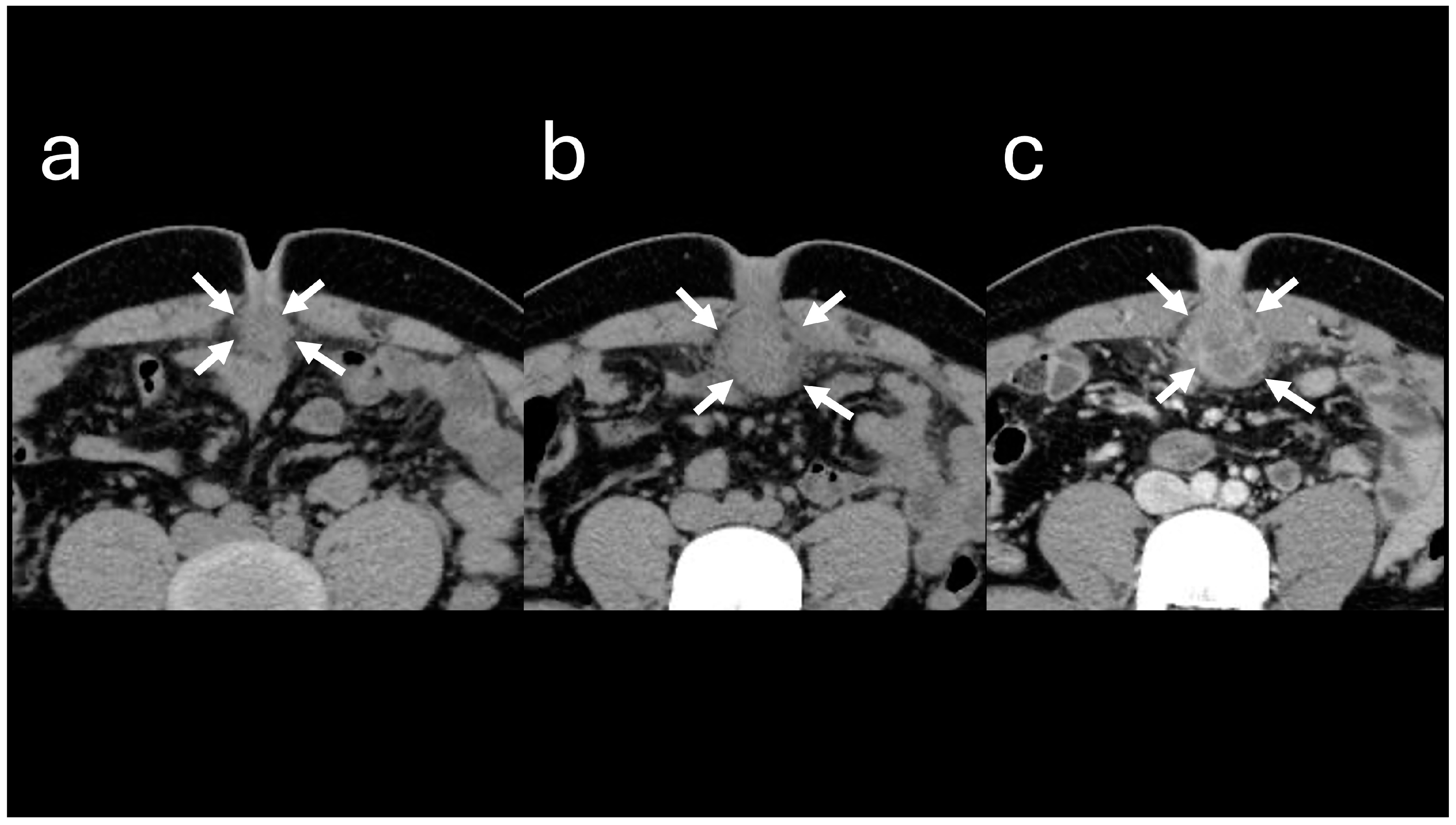 8]. If there is little discharge from the umbilicus or if a physician examines the abdomen without specifically inspecting the umbilicus, an infected urachal remnant may be overlooked. Moreover, in cases similar to that presented in this report, when the discharge from the umbilicus is not observed or noticed at the time of initial visit and the patient complains only of abdominal pain, diagnosis is challenging. When the patient in the current case presented at our hospital, Carnett’s sign was positive upon physical examination. Carnett’s sign may be useful in distinguishing extraperitoneal diseases, such as infected urachal remnants, from intraperitoneal diseases [