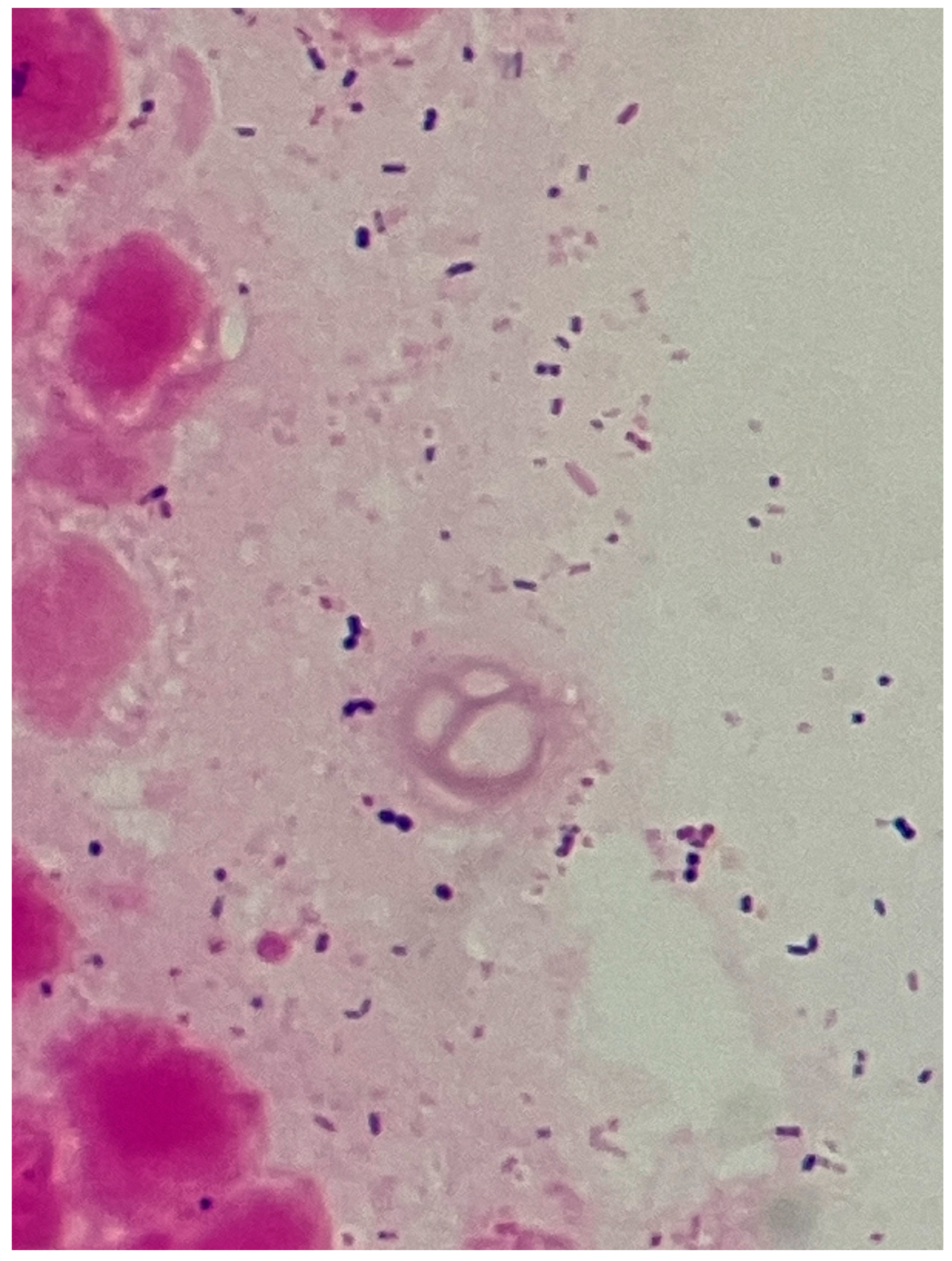 The semi-quantitative bacterial grading (1+, 2+, etc.) was performed according to the microbiology laboratory’s standard operating procedures to ensure consistent estimation of bacterial load. The criteria were as follows: 1+: A few colonies are observed across the entire field of view (estimated 103 cfu/mL). 2+: One to a few colonies are observed in every field of view (estimated 104 cfu/mL). 3+: Several tens or more colonies are observed in every field of view (estimated 105 cfu/mL or more).