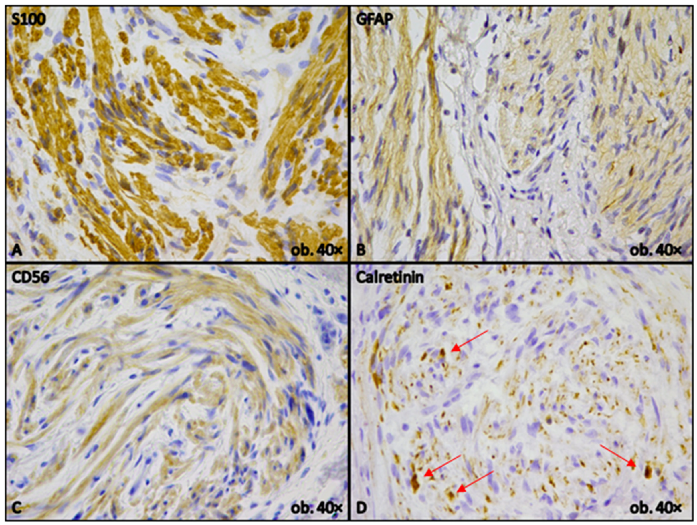- Magro, G.; Broggi, G.; Angelico, G.; Puzzo, L.; Vecchio, G.M.; Virzì, V.; Salvatorelli, L.; Ruggieri, M. Practical Approach to Histological Diagnosis of Peripheral Nerve Sheath Tumors: An Update. Diagnostics 2022, 12, 1463. [Google Scholar] [CrossRef] [PubMed]