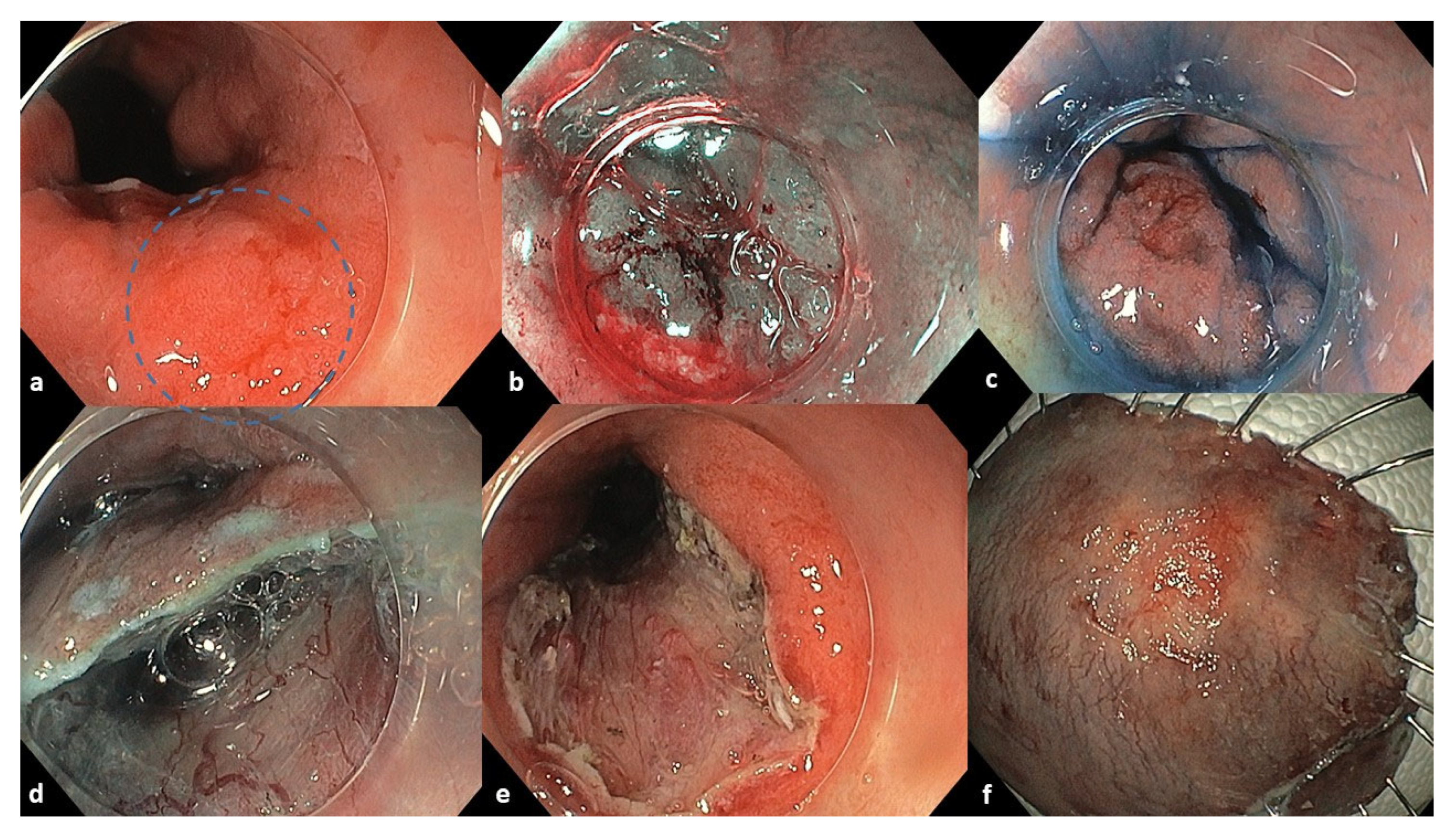 - Pimentel-Nunes, P.; Libanio, D.; Bastiaansen, B.A.J.; Bhandari, P.; Bisschops, R.; Bourke, M.J.; Esposito, G.; Lemmers, A.; Maselli, R.; Messmann, H.; et al. Endoscopic submucosal dissection for superficial gastrointestinal lesions: European Society of Gastrointestinal Endoscopy (ESGE) Guideline—Update 2022. Endoscopy 2022, 54, 591–622. [Google Scholar] [CrossRef]