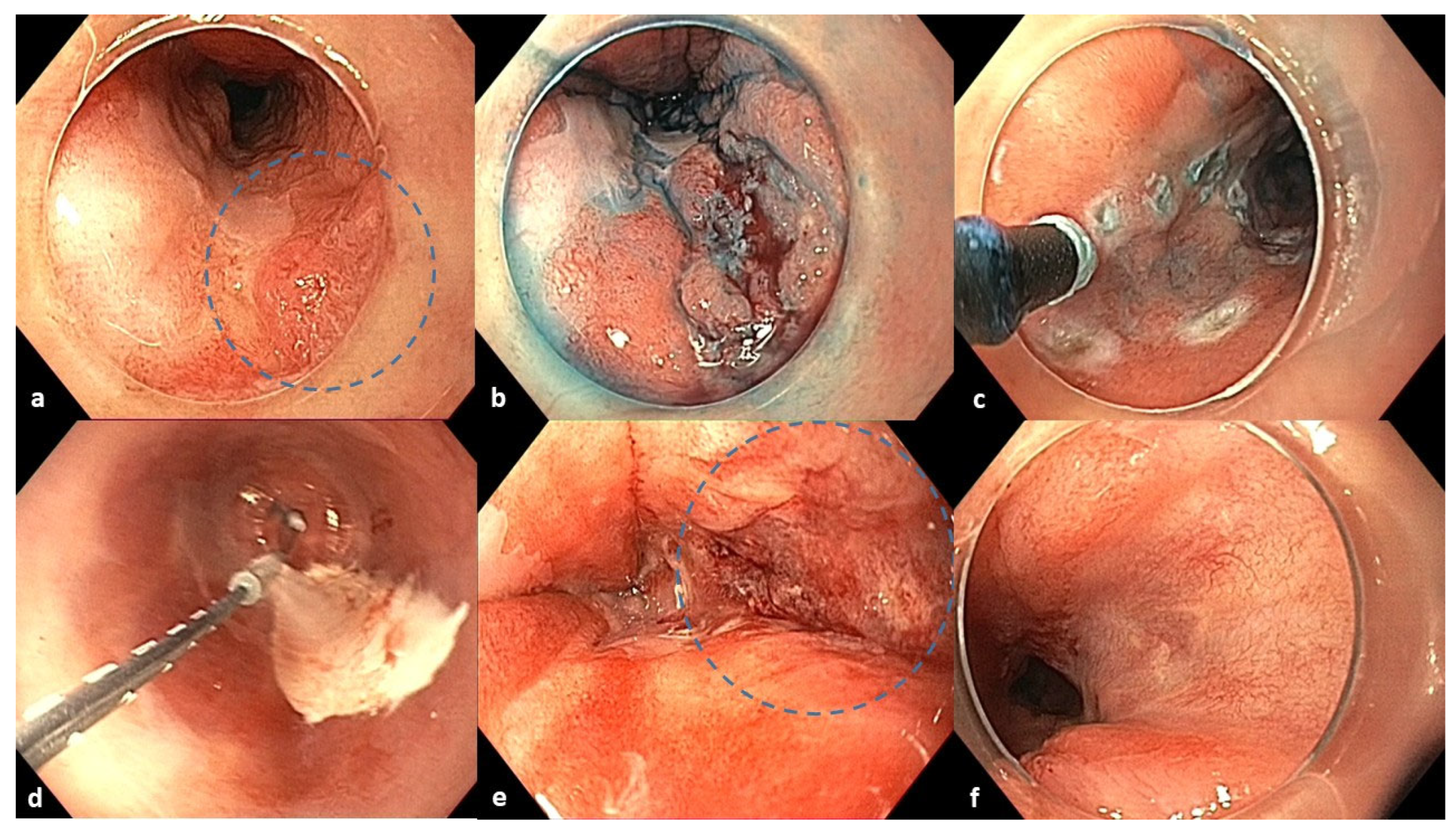 - Sunakawa, H.; Yoda, Y.; Nonaka, S.; Suzuki, H.; Abe, S.; Ishiguro, Y.; Ikeno, T.; Wakabayashi, M.; Sato, A.; Nakajo, K.; et al. Prospective multicenter trial of the cryoballoon ablation system for superficial esophageal squamous cell carcinoma on post–endoscopic resection scars: A CRYO-SCAR study (EPOC1902). Gastrointest. Endosc. 2024, 100, 429–437. [Google Scholar] [CrossRef] [PubMed]
