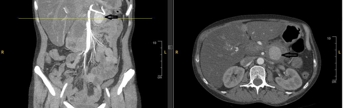 - Abbas, A.; Mahmoud, F.; Gaba, W. Splenic artery pseudoaneurysm; a cause or consequence: A case report. J. Med. Case Rep. 2024, 18, 253. [Google Scholar] [CrossRef] [PubMed]