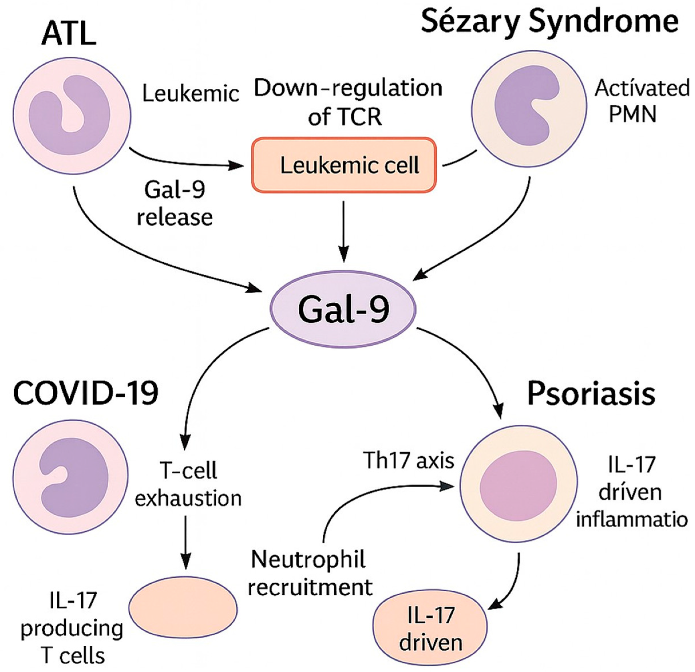 Hattori, T. Neutrophil–Galectin-9 Axis Linking Innate and Adaptive Immunity in ATL, Sézary Syndrome, COVID-19, and Psoriasis: An AI-Assisted Integrative Review. Reports 2026, 9, 16. https://doi.org/10.3390/reports9010016