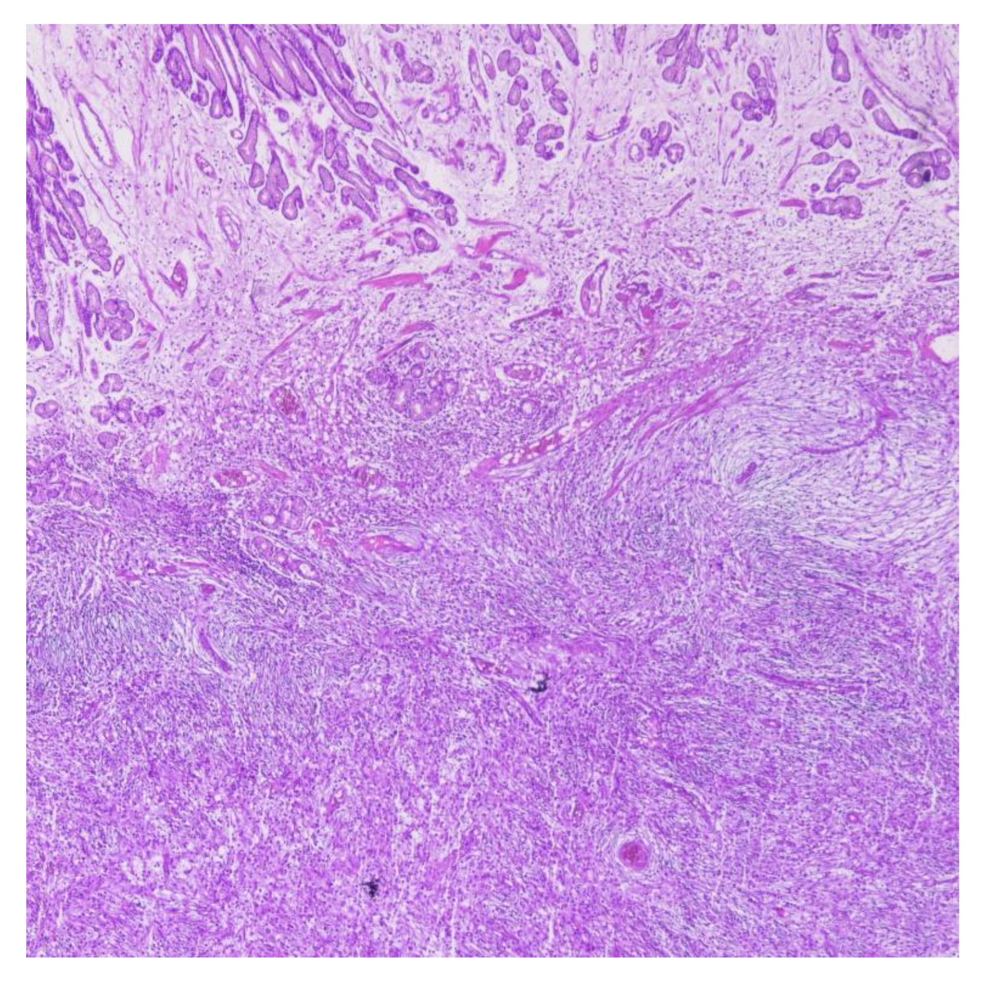 - Montgomery, E.A.; Meis, J.M. Nodular fasciitis: Its morphologic spectrum and immunohistochemical profile. Am. J. Surg. Pathol. 1991, 15, 942–948. [Google Scholar] [CrossRef] [PubMed]