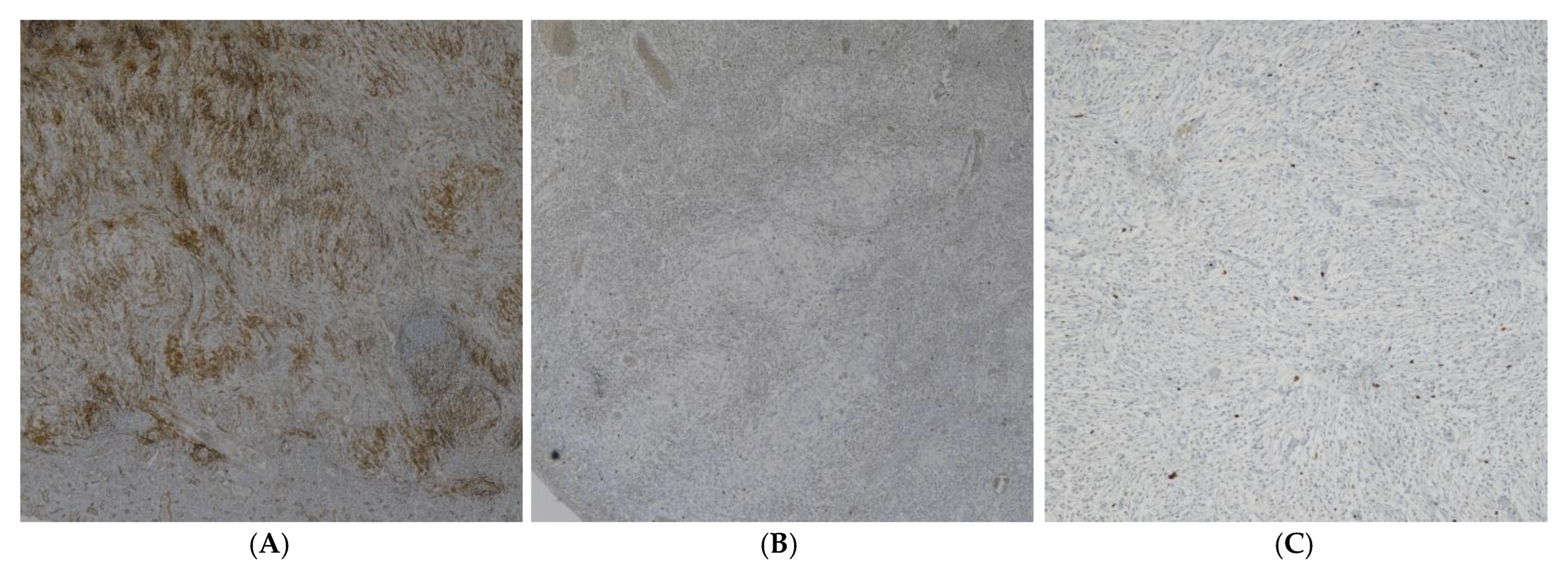 | Gastrointestinal stromal tumor (GIST) | Spindle or epithelioid cells; variable cellularity | CD117 (c-KIT)+, DOG1+, often CD34+; PDGFRA mutations in subset | Malignant potential; requires risk stratification (size, mitotic index); responds to tyrosine kinase inhibitors |
