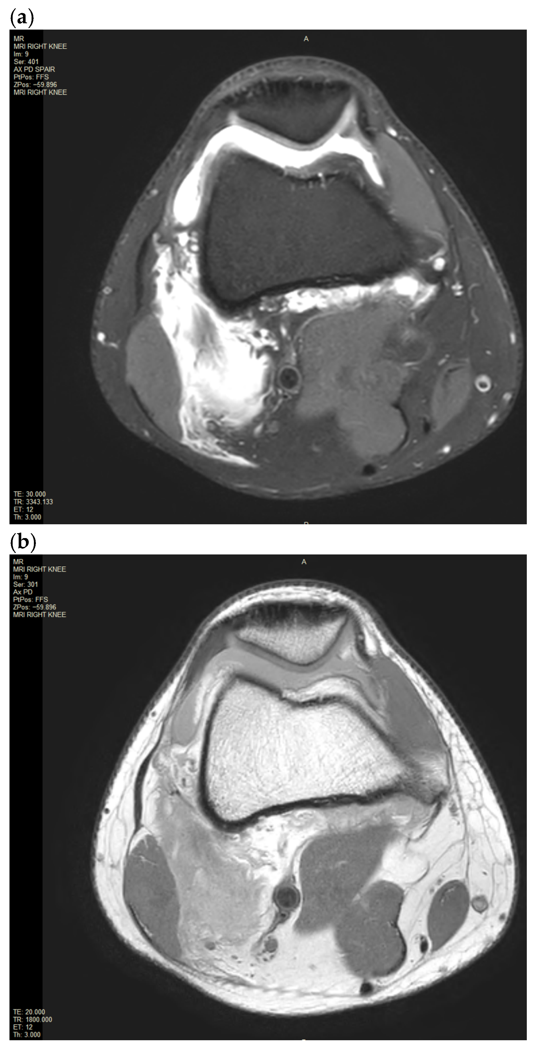Figure 1). The X-ray demonstrated marked soft tissue swelling of the knee joint with moderate effusion extending into the supra-patella recess. There was no evidence of acute or recent bony injury. The presence of radiological joint effusion raised suspicion for potential ligamentous or meniscal injuries. Subsequently, a magnetic resonance image (MRI) of the right knee was performed to further characterise the injury. MRI was obtained with a 1.5T Philips Achieva dStream MRI (Philips, Amsterdam, Netherlands) with Release 5.7 software. The routine knee protocol was performed, including sequences as follows: Axial Proton Density T2-weighted Turbo Spin Echo (Axial PD TSE), Proton Density Spectral Attenuated Inversion Recovery (PD SPAIR), Sagittal PD TSE, PD SPAIR, Coronal PD TSE, PD SPAIR (