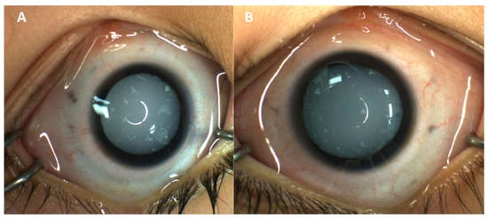 External photography of right (A) and left (B) eyes, highlighting diffuse cataracts bilaterally with scattered, white fleck-like opacities in the anterior lens after pharmacologic dilation.