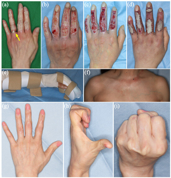 Outcome: At the final follow-up (POD 821 after FTSG), the reconstructed dorsal fingers showed no hypertrophic scarring (Figure 1g). The right infraclavicular donor site demonstrated satisfactory long-term appearance (Figure 1f). Functional photographs confirmed full finger motion and full fist formation (Figure 1h,i). The patient reported no limitation in activities of daily living. At that time, she reported no pain or pruritus and was very satisfied with the outcome. The Vancouver Scar Scale (VSS; total 0–13, lower is better) score was 2 (vascularity 0, pigmentation 0, pliability 1, height 1), and the QuickDASH score was 0.
