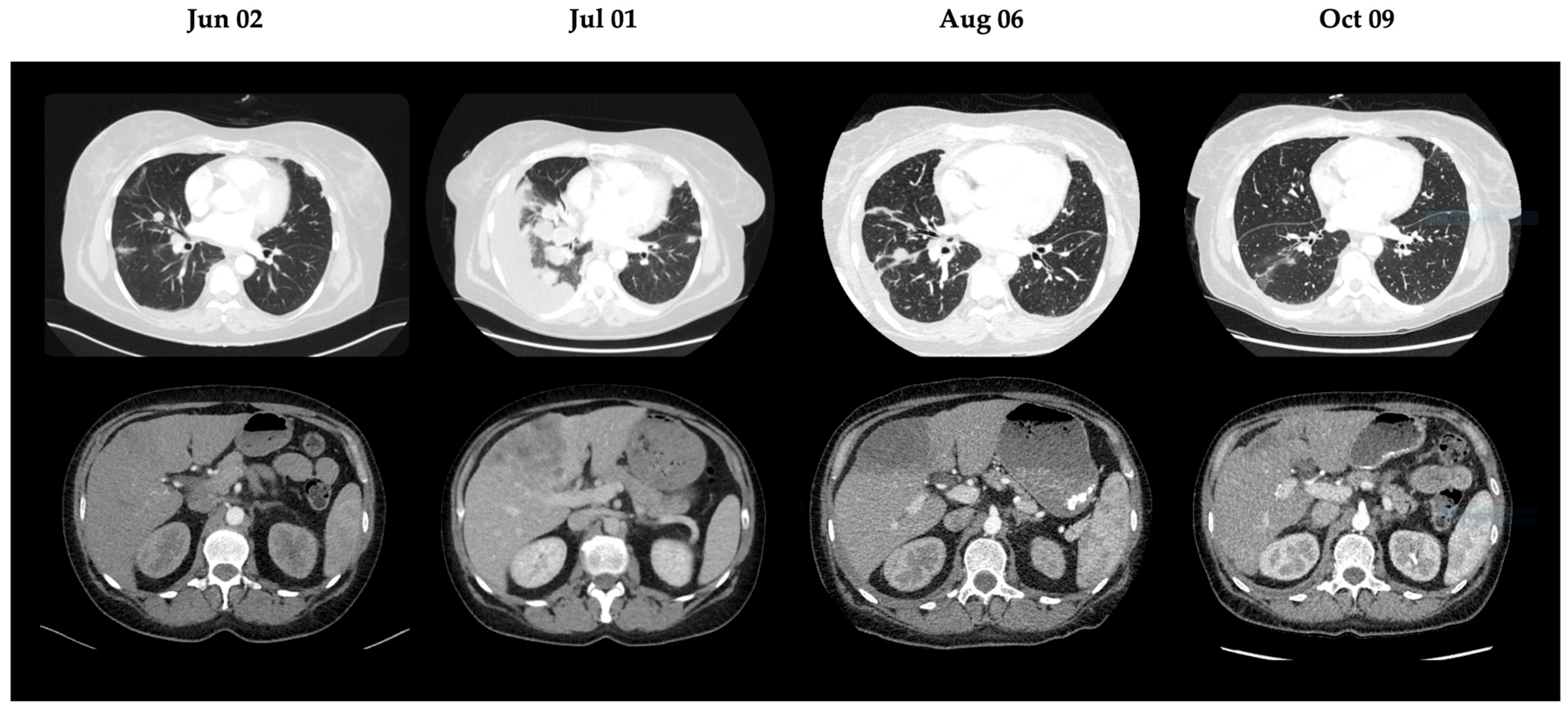 | 1 July 2025 | CT thorax/abdomen | Progression of pulmonary tumors and hepatic metastases |