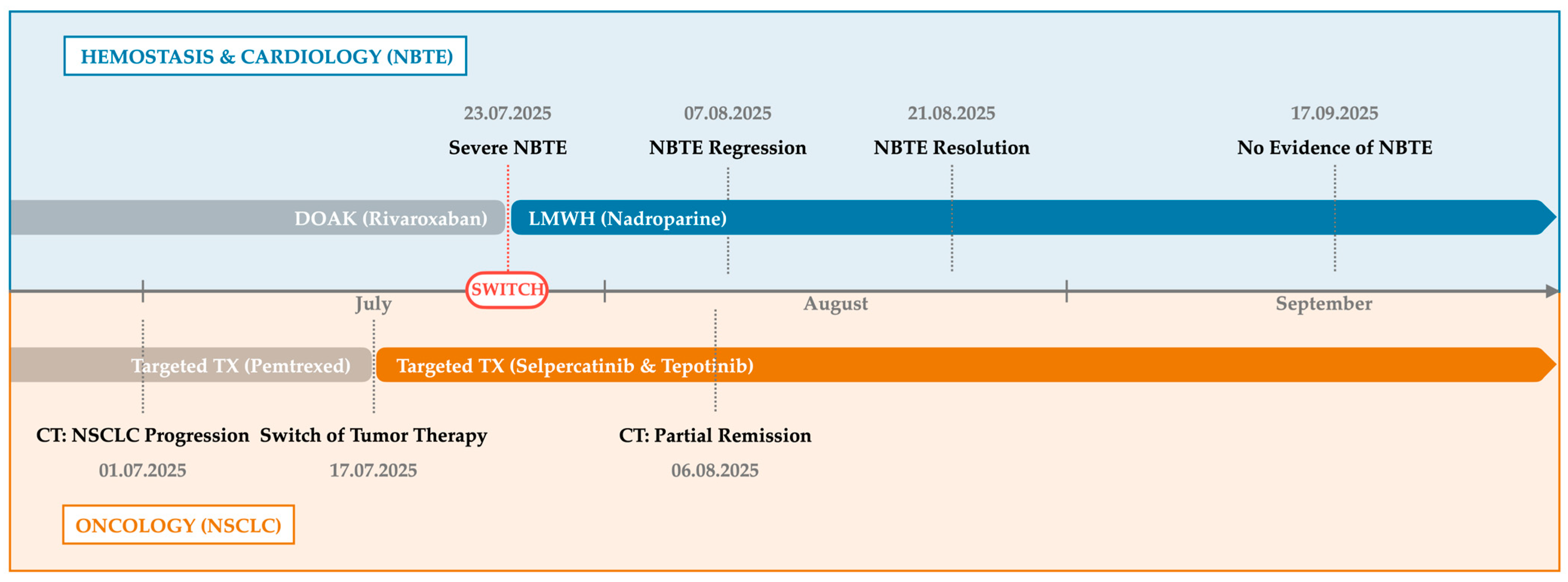 - Targeted oncologic therapy: To address both the primary RET fusion and the acquired MET (mesenchymal–epithelial transition) amplification resistance mechanism, combined treatment with selpercatinib (RET inhibitor, continued at 160 mg twice daily) and tepotinib (MET inhibitor, 450 mg once daily) was initiated on 17 July 2025.