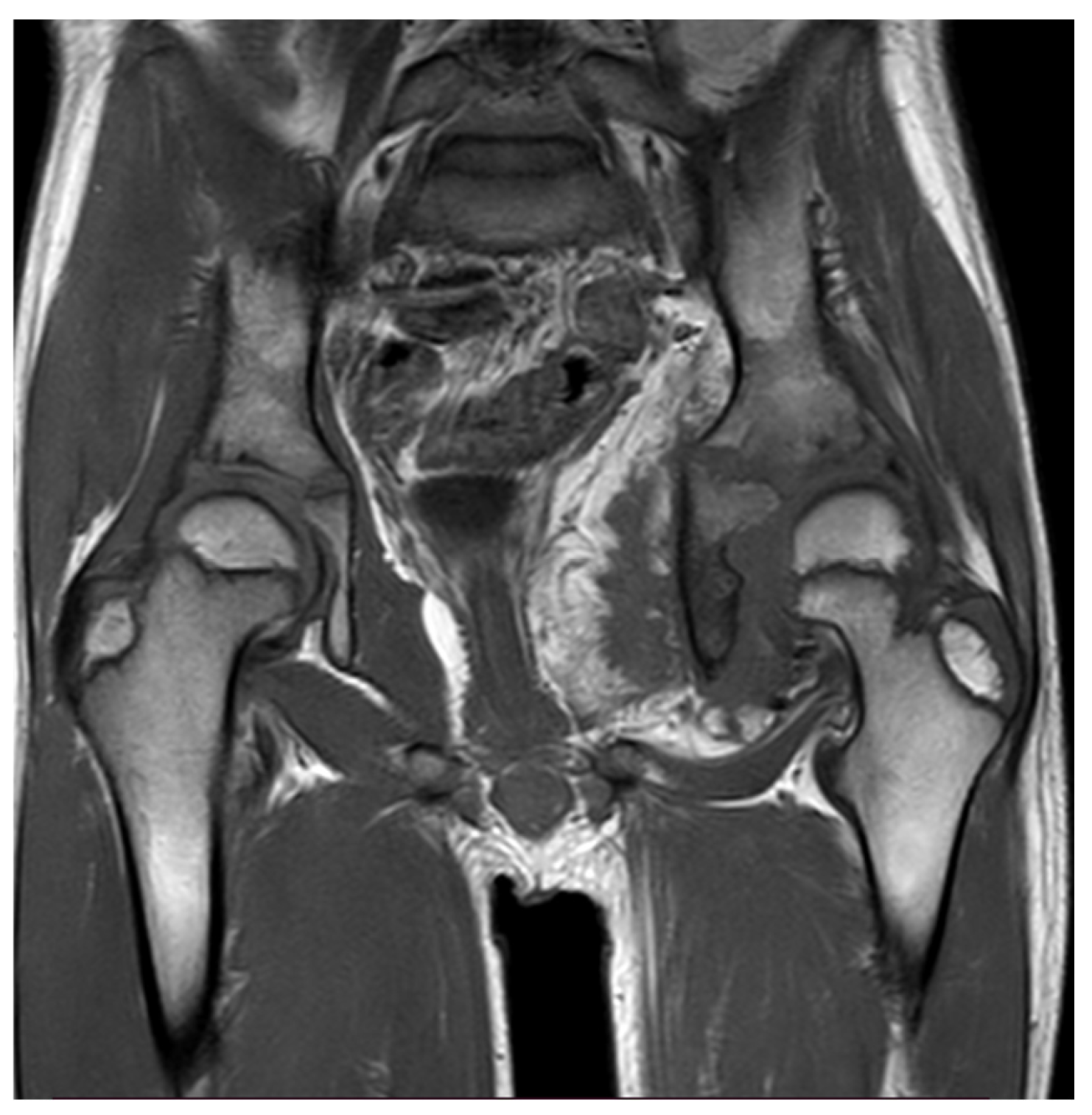 Thirteen months later, the patient underwent a new pelvis MRI examination due to the symptoms worsening and a significant decrease in the range of motion of the left hip. MRI revealed a large heterogeneous soft-tissue mass in the abdominal cavity, with extension to the hip joint, presenting both fat and muscle signal intensity with heterogeneous enhancement post gadolinium, and associated with extensive peri-osseous fatty infiltration, a reactive soft-tissue component, and advanced severe atrophy of the left obturator muscles (