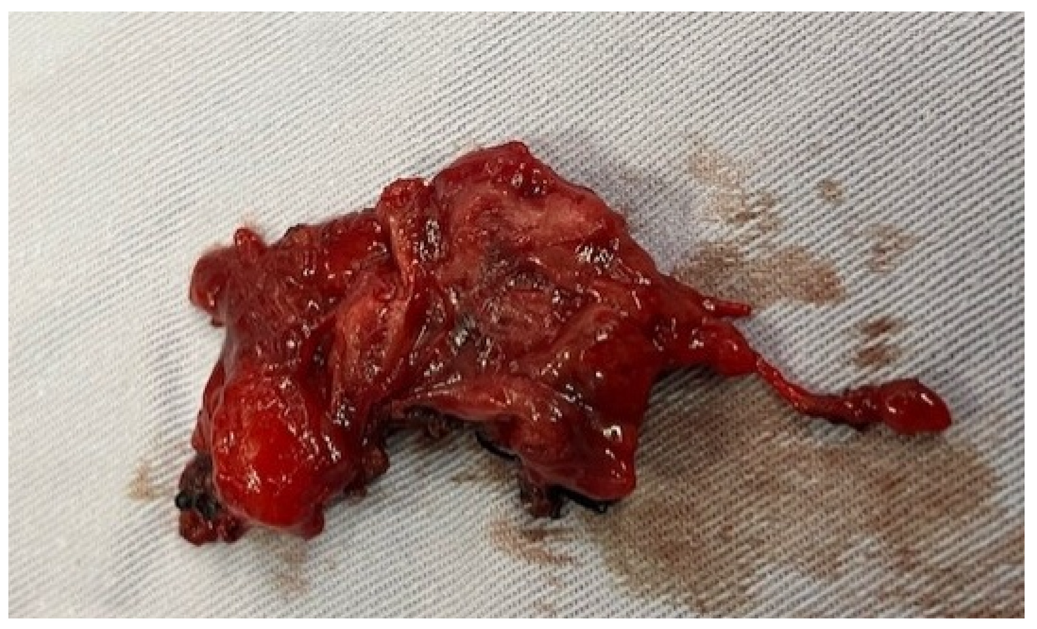 The surgical approach employed was an extended Smith–Petersen approach, continued medially to the midline through a horizontal incision. Intraoperatively, guided by preoperative MRI findings, the surgeon traced the diseased tissue and identified its attachment to the lateral internal pelvic wall, with extension through the ischium toward the acetabulum.