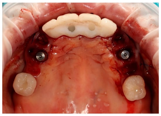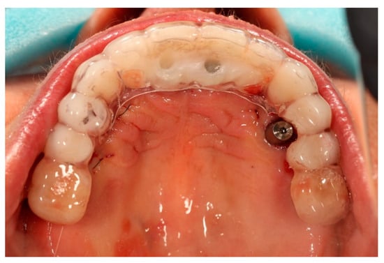 At the end of the procedure, the transparent acrylic splint was fixed on the remaining prosthetic restorations, ensuring that no contact or pressure was applied to the healing screws at positions 14 and 24 (