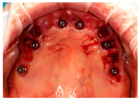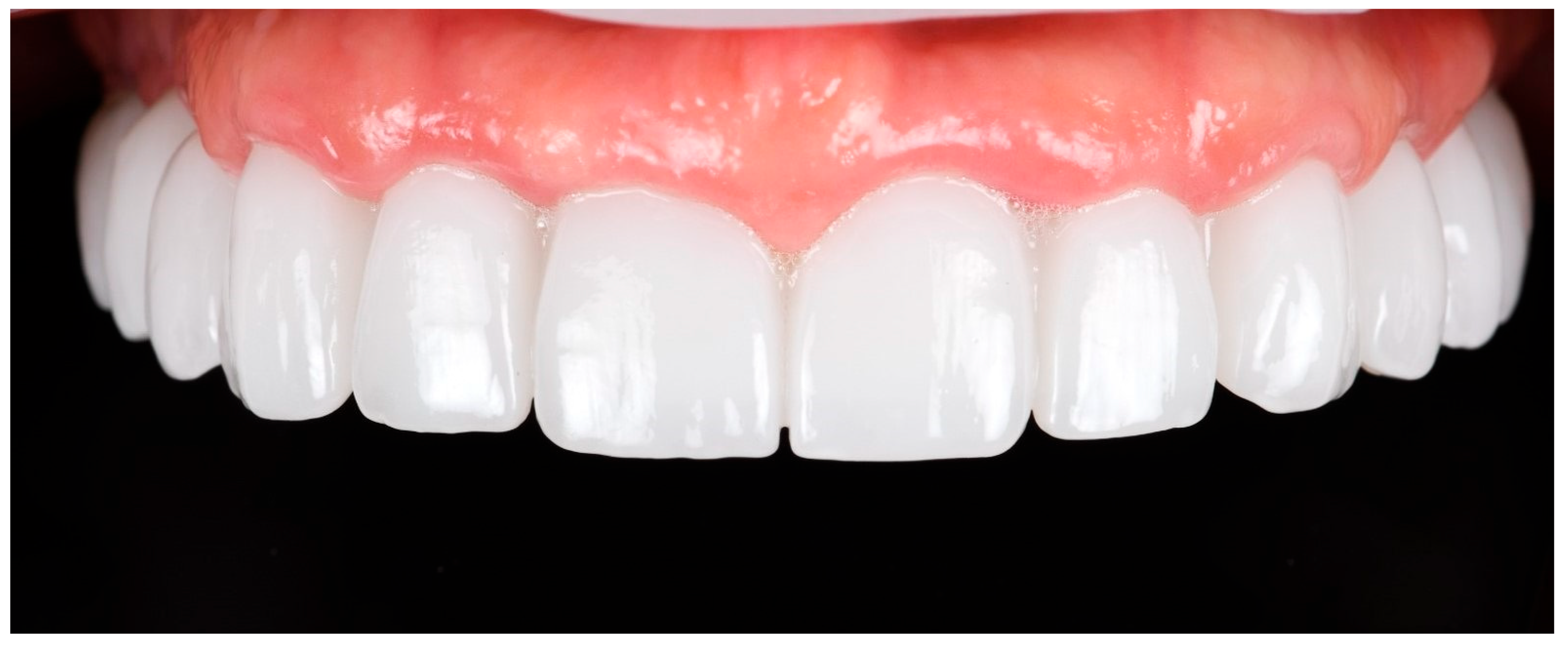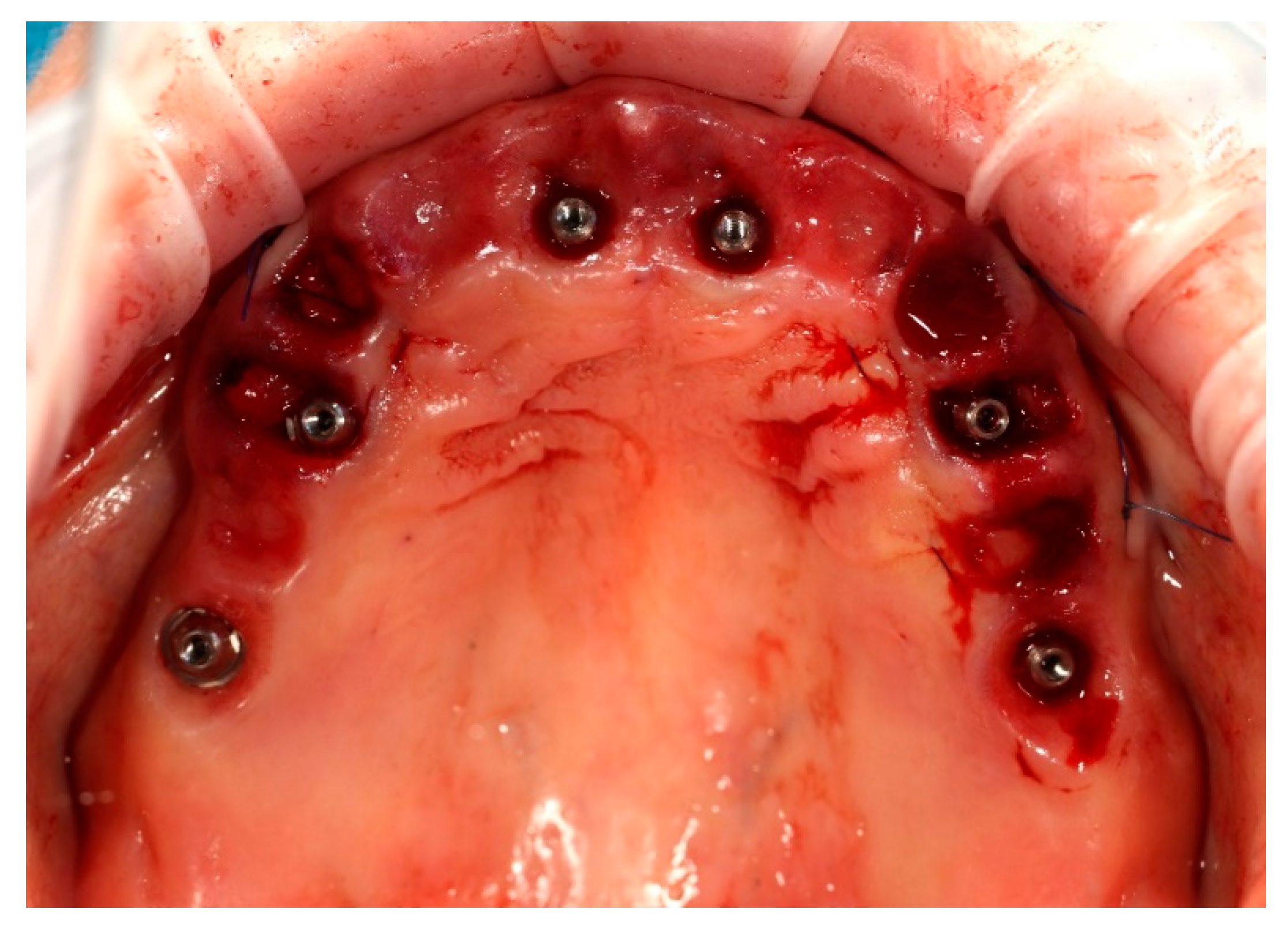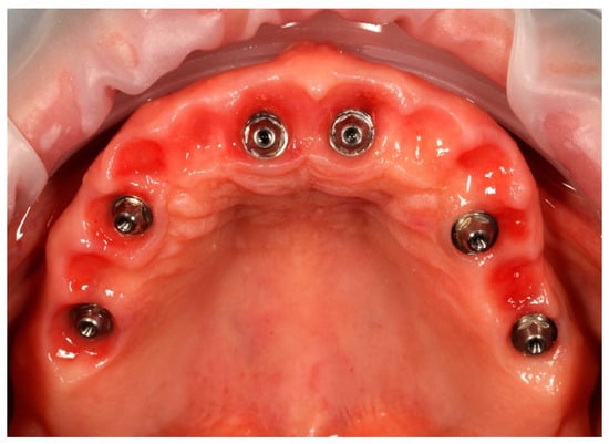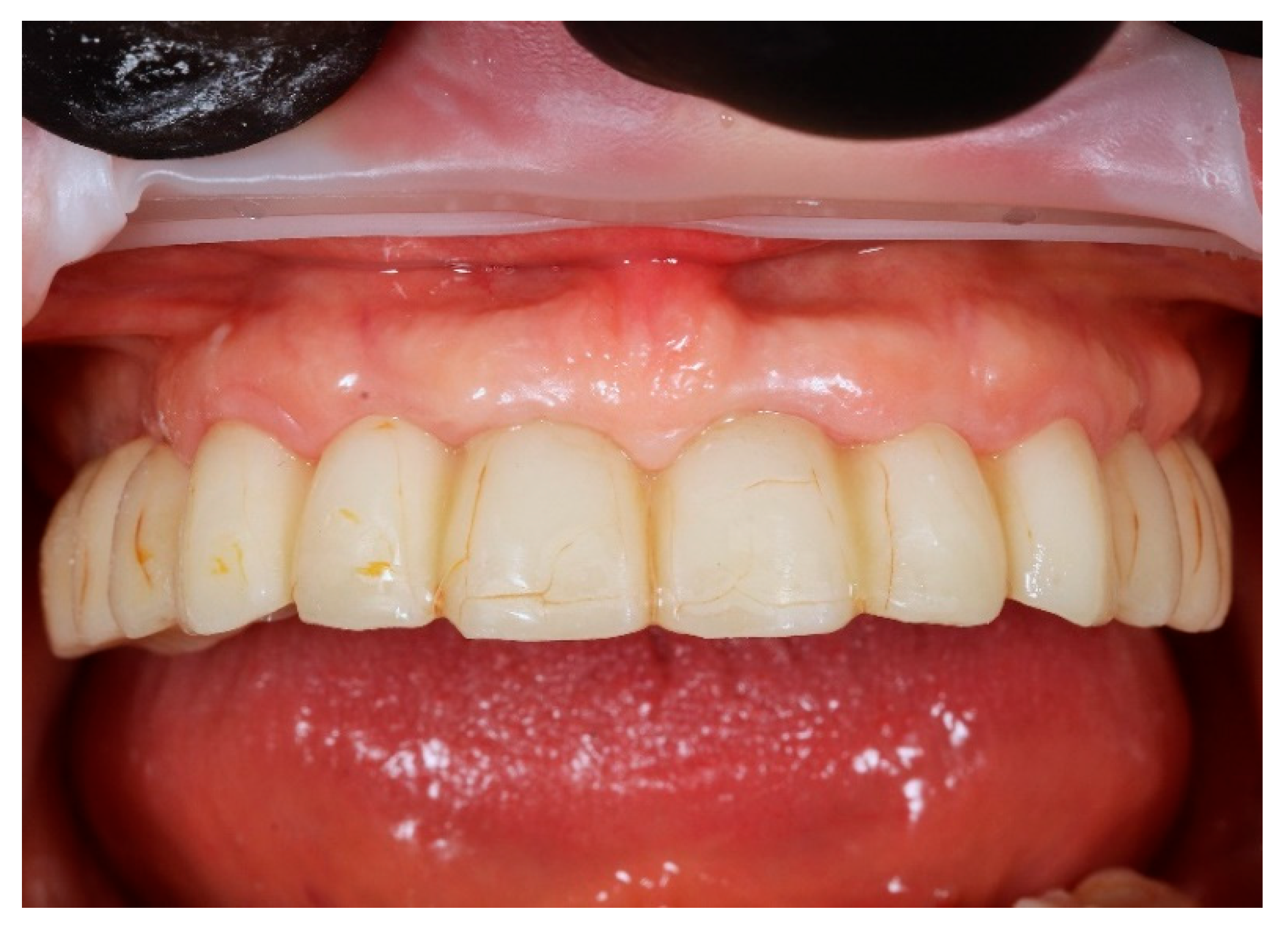 Upon removal of the provisional bridge from the multi-unit abutments, well-conditioned soft tissues were observed, adequately shaped by ovate pontics and corresponding to the requirements of the FP1-type full-arch prosthesis (