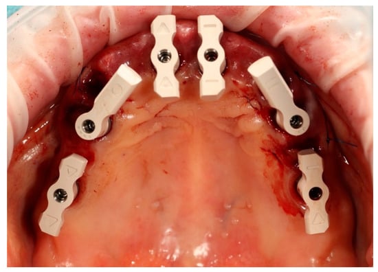 The next appointment was scheduled after 24 h. At the 24 h follow-up, the clinical situation was considered appropriate for proceeding with the provisional restoration. The existing prosthetic restorations were unscrewed from the implants, and the previously selected multi-unit abutments were mounted on all four supporting implants, excluding the newly placed ones, where the closing caps were removed.