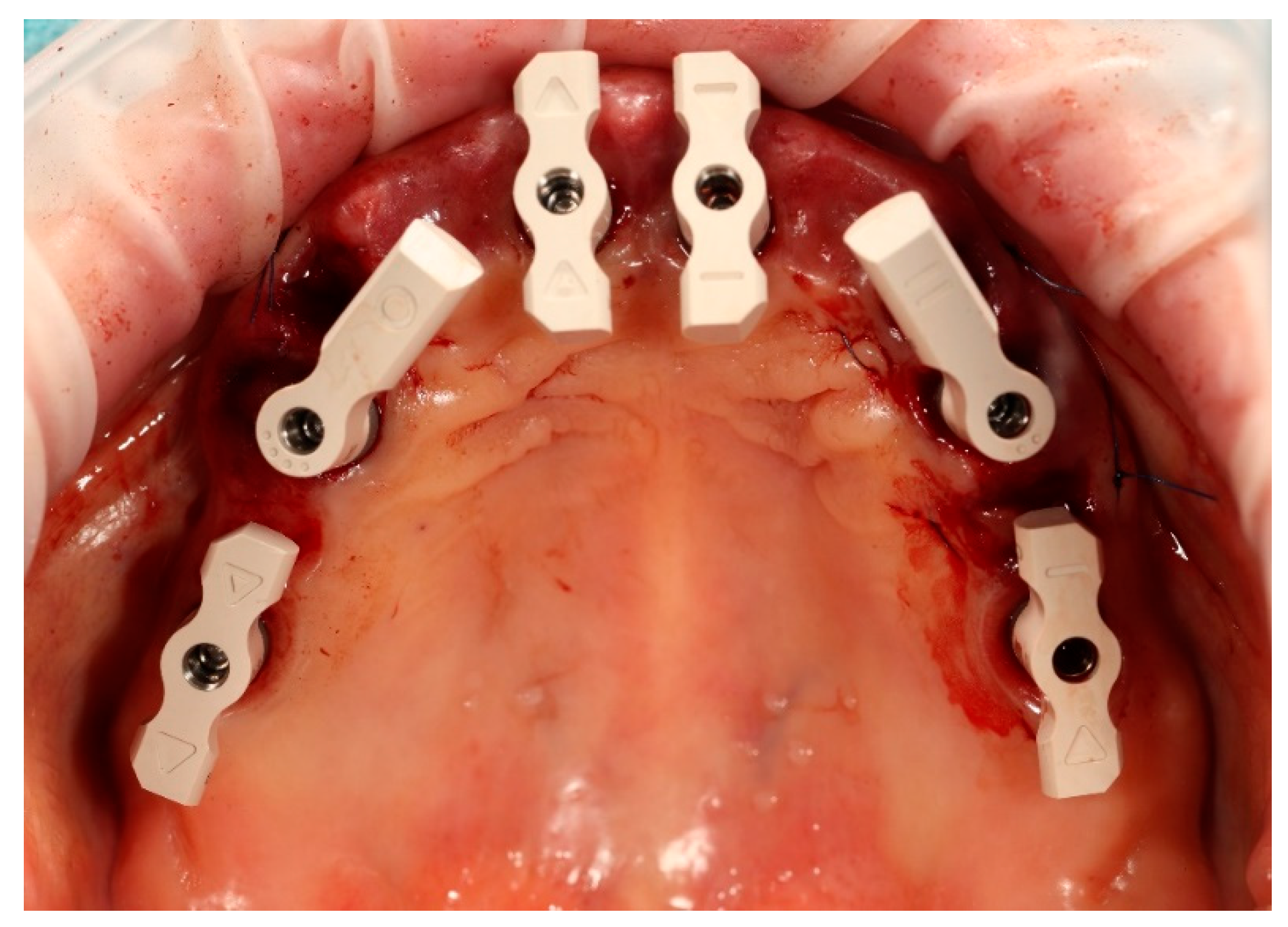 Simultaneously, the existing implant-supported crowns in positions 16 and 26, as well as the anterior implant-supported bridge, were unscrewed from the supporting implants. Multi-unit abutments were then selected and secured onto all six supporting implants, including the newly placed implants at sites 14 and 24 (