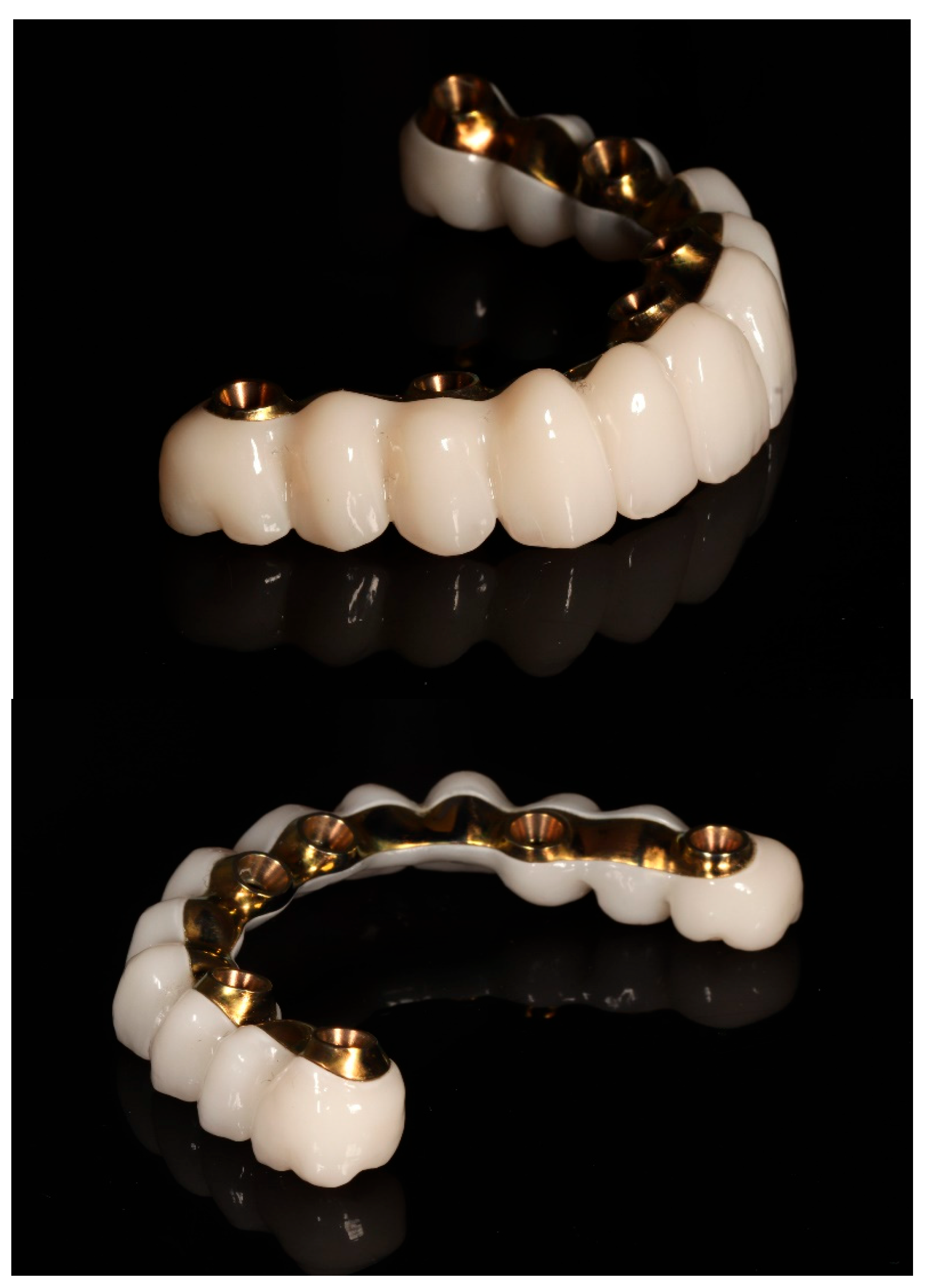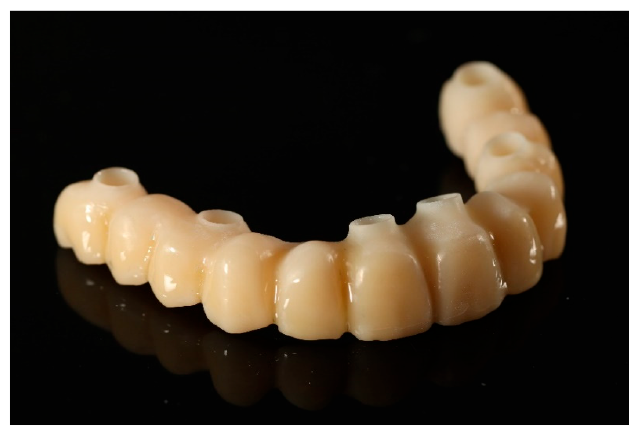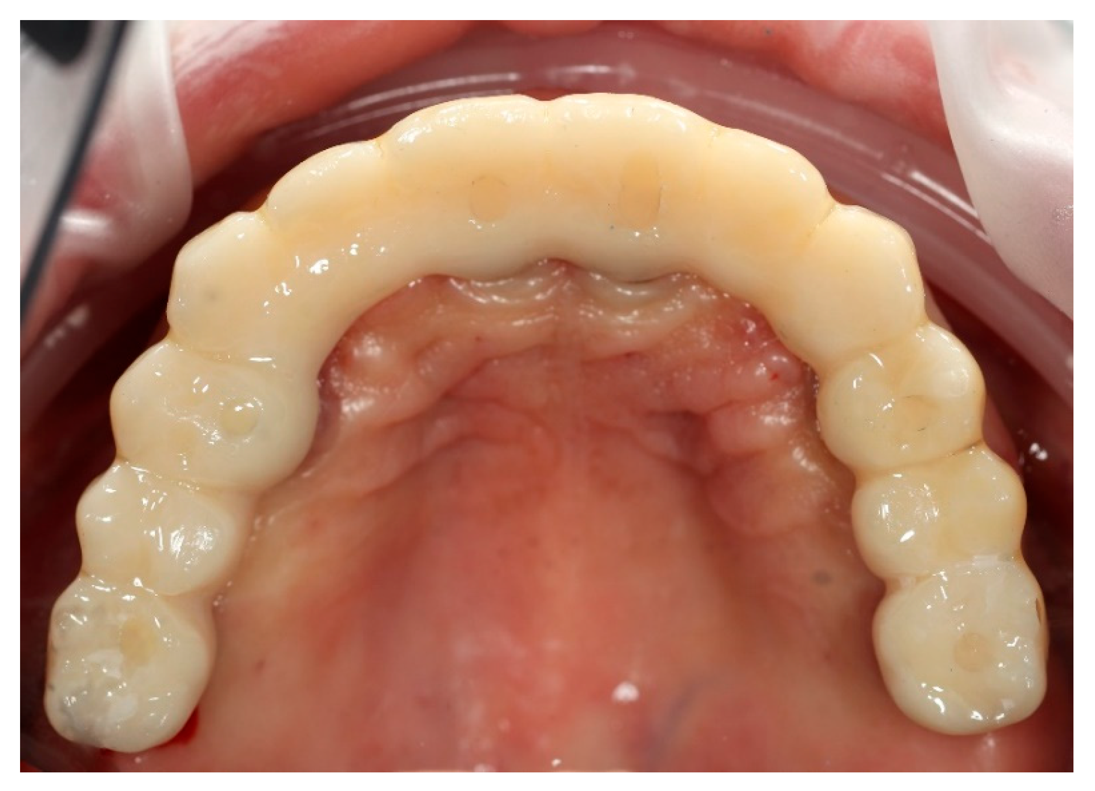 ® scan), the provisional screw-retained, implant-supported full-arch prosthesis was designed in Exocadsoftware (Exocad GmbH, Darmstadt, Germany) and subsequently fabricated using OnX Tough 2 resin (SprintRay Inc., Los Angeles, CA, USA) by means of 3D printing. The intaglio (tissue-facing) surface was polished [