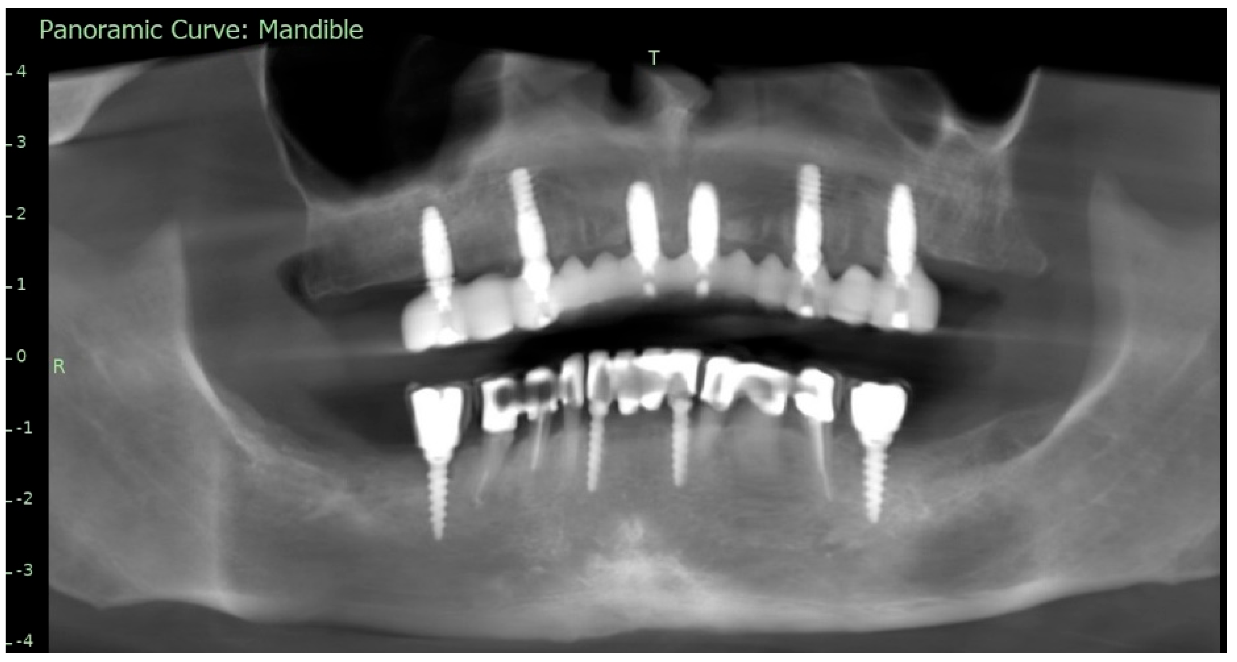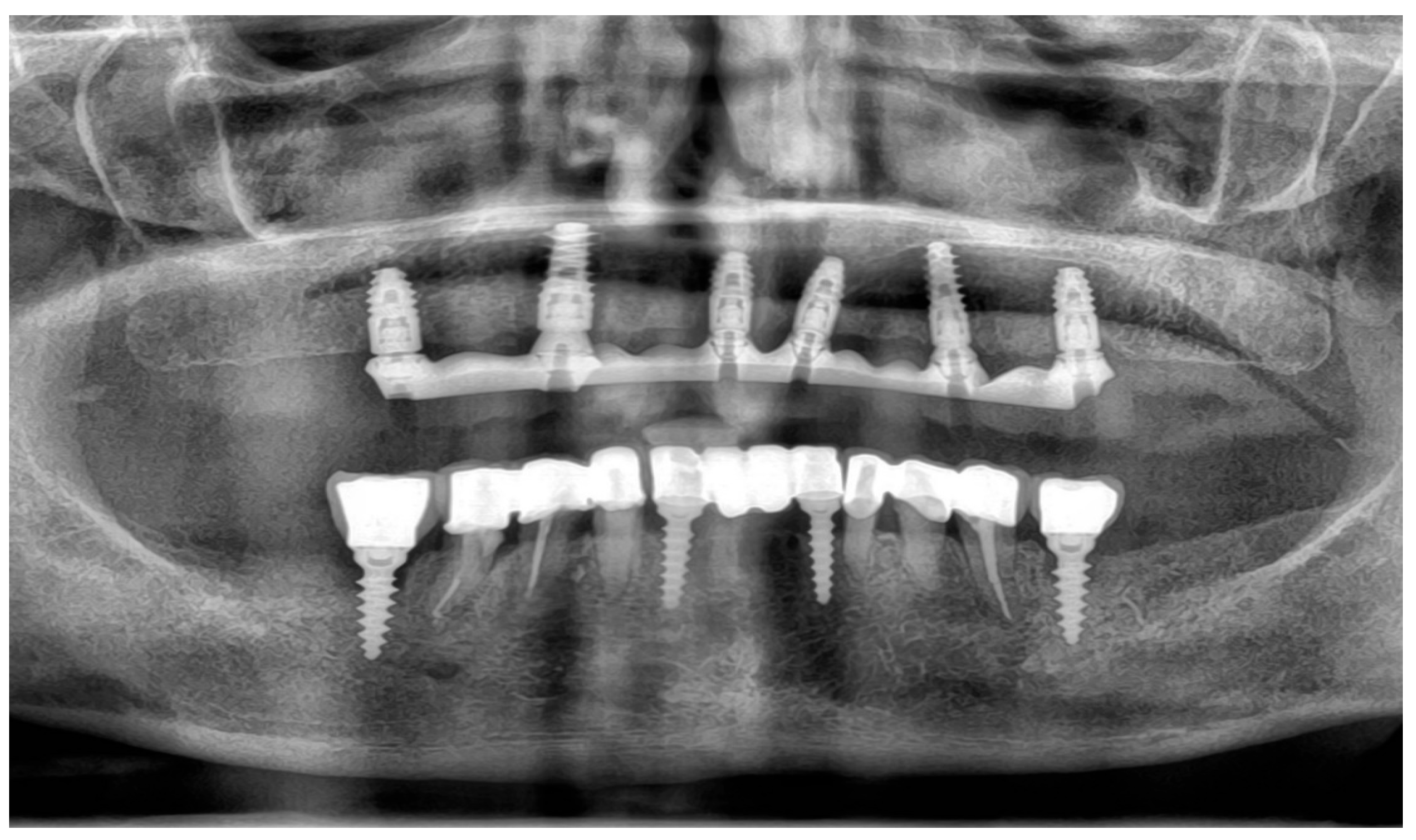 28]. A panoramic radiograph was obtained at the time of prosthesis delivery to confirm the correct seating of the framework–zirconia assembly on all supporting implants, as well as to verify stable peri-implant bone conditions.