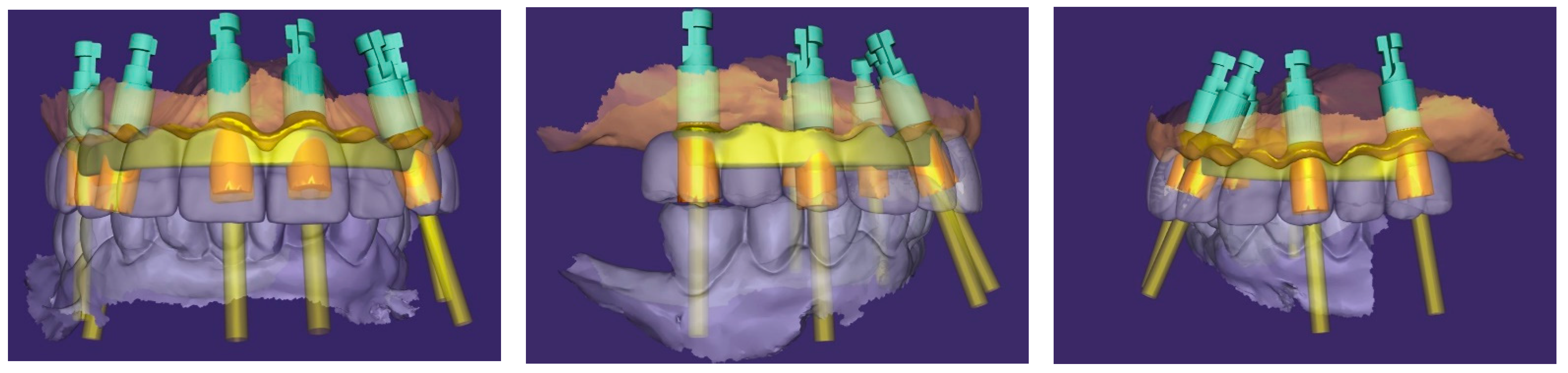 In addition to CBCT evaluation, clinical photographs were taken, and intraoral scans of the existing prosthetic work were acquired to preserve the vertical dimension of occlusion, phonetics, and aesthetics as a digital reference (biocopy). A Dexis intraoral scanner (Dental Imaging Technologies Corp., Hatfield, PA, USA) was used. These datasets were planned to be merged later with implant position scans to provide continuity between the preoperative and postoperative stages.