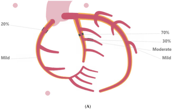 Hypokinesis was observed in the mid to distal anterior, anteroseptum, and apical segments, and apex appeared hypokinetic at peak stress. Coronary arteries’ CT calcium score was 1066 with a distribution of 33 in the left main artery (LMA), 507 in the left anterior descending (LAD) coronary artery, 107 in the left circumflex coronary artery (LCx), and 419 in the right coronary artery (RCA) territory. Subsequent coronary angiography revealed mild diffuse disease throughout the LMA; moderate diffuse disease in the LCx, with 70% stenosis in the mid-portion and 30% stenosis in the second obtuse marginal branch; and mild diffuse disease of the RCA, with 20% stenosis of the proximal portion. A drug-eluting stent (DES) in the LCx was placed, followed by dual antiplatelet therapy (DAPT) which was discontinued after 2 months to ensure liver transplant listing (Figure 2).