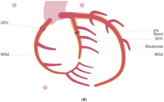 Panel (A) presents a diagnostic coronary angiography performed during pre-transplant evaluation. Mild diffuse disease in the left anterior descending coronary artery (LAD), moderate diffuse disease in the left circumflex (LCx) coronary artery with 70% stenosis in the mid-portion and 30% stenosis in the second obtuse marginal branch, and mild diffuse disease of the right coronary artery (RCA) with 20% stenosis of the proximal portion were found; panel (B) shows placement of a drug-eluting stent in the LCx with no residual stenosis.