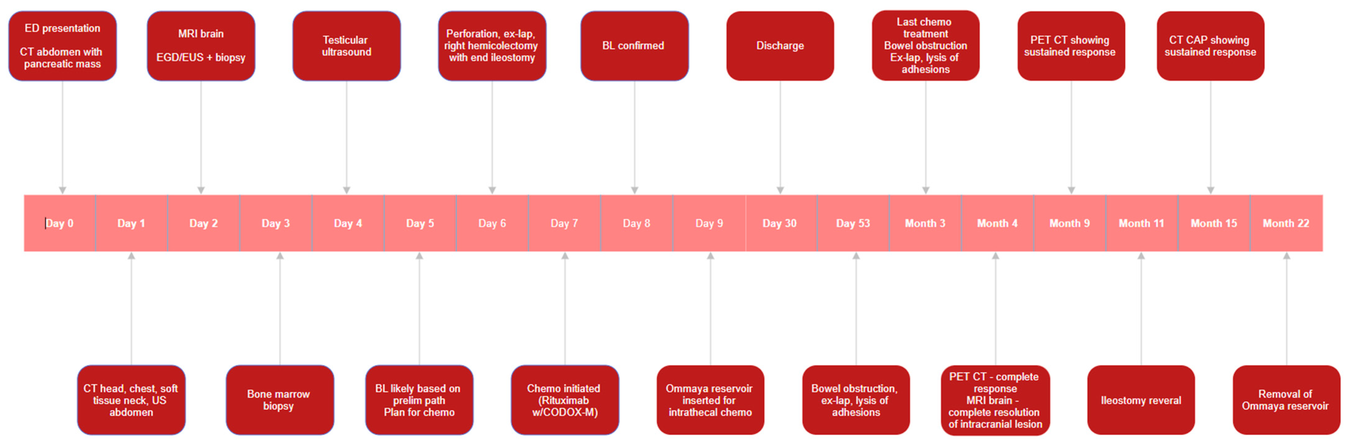 | 10 | 2026 | Present case | 23/M | -/- | 402 | Retroperitoneal mass encasing the pancreas, pancreatic head mass | CD10+, CD19+, CD20+. Ki-67 ~100%. c-Myc rearrangement. Bcl-2-, Bcl-6- by FISH. | I | Rituximab, cyclophosphamide, doxorubicin, vincristine, methotrexate, iphosphamide, etoposide, cytarabine | Complete response/Alive at 2-year follow-up |