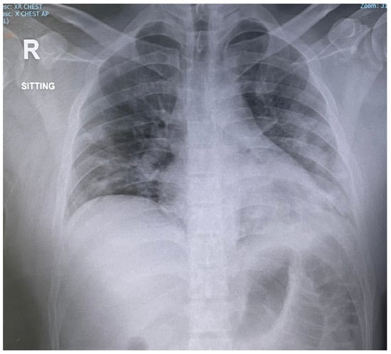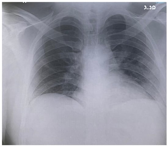 A 29-year-old generally healthy male with no smoking history presented to the ER with dyspnea, fever, and cough for about 10 days before his admission; in the ER his blood pressure was 108/69 mHg, pulse at 90 per min, fever of 38.2 °C, and oxygen saturation of 95% on room air. His blood analysis showed a mild lymphopenia of 0.9 K/μL, D-Dimer of 0.6 μg/mL, normal liver and kidney function tests with no electrolyte imbalance, and his C-reactive protein was 13.6. The chest-X-ray revealed bilateral pulmonary infiltration (Figure 1), and a nasal swab was positive for SARS-COV-2 RNA. Initial treatment in the emergency room consisted of I.V ceftriaxone at 1 gm intravenously.