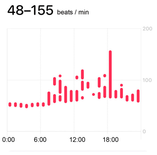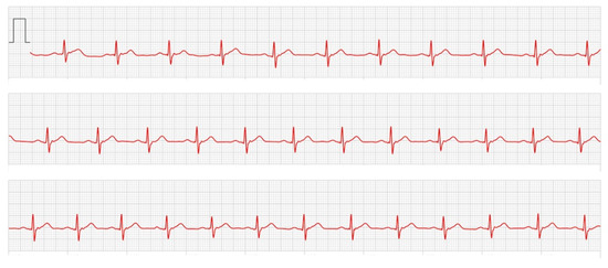 The patient was working on his personal computer in his office when he became aware of the arrhythmia and simultaneously received a notification from his Apple Watch that he was experiencing a tachycardia exceeding 120 bpm (Figure 1). The patient’s pulse rate exceeded 150 bpm, and he activated the ECG app on his Apple Watch to obtain a series of ECG tracings. (Figure 2: 30-s ECG that was collected during an arrhythmic attack; Figure 3: 30-s ECG that was collected at the time of the arrhythmia; Figure 4: 30-s ECG that was collected 30 min after the arrhythmic attack). The patient was aware of the arrhythmia for approximately 3 min. A loss of consciousness did not occur. The arrhythmia resolved without any intervention having been performed such as the Valsalva maneuver or a carotid massage.