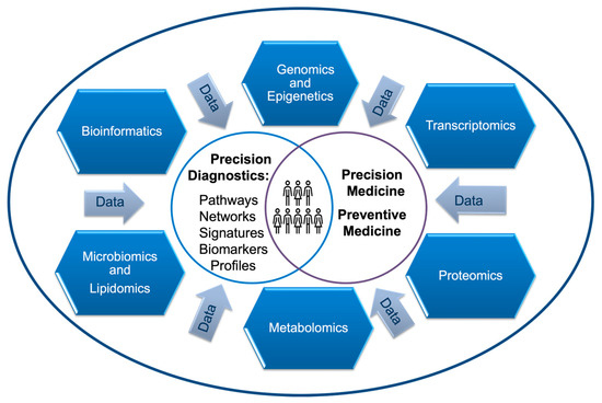Contribution of individual omics disciplines (outlined in hexagons) to population-centric precision medicine and preventive medicine innovation. Data collected from various individual omics technologies provide comprehensive information (depicted by arrows) to allow for the identification of novel biomarkers, signatures, pathways, profiles, and networks (precision diagnostics). Omics technologies have become a part of precision diagnostic medicine, customizing population-centric treatments (precision medicine) and leading to novel vaccine development (preventive medicine).