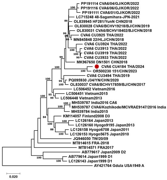 A phylogenetic tree was generated using MEGA software (v10), employing the maximum likelihood method with the Kimura 2-parameter model. Bootstrapping was performed with 1000 replicates to ensure statistical reliability (Figure 3). Phylogenetic analysis of the 37 nearly complete genomes showed that the CVA6 strain from this study closely clustered with strains reported from China in 2023, sharing a high nucleotide sequence homology of 98.4%. This CVA6 strain showed nucleotide sequence homology with Thai strains from 2022, ranging from 93.7% to 99.5%, as well as with the Gdula prototype strain, at 80.7%.