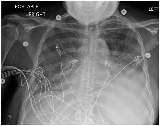 Chest X-ray showing pulmonary edema with a left-sided pleural effusion.