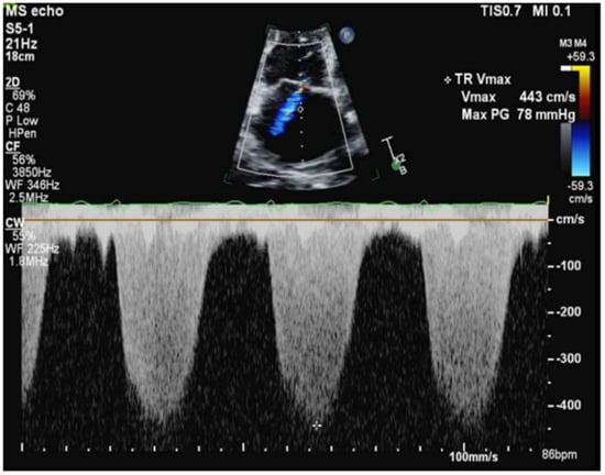 Transthoracic echocardiography (TTE) demonstrated preserved left ventricular function (62%), but severe right ventricular dilation with decreased function, severe tricuspid regurgitation, and significant PH (Figure 4). A ventilation/perfusion scan revealed a low probability for PE, and pulmonary function tests indicated a moderately severe restrictive ventilatory defect. Left heart catheterization revealed non-obstructive coronary artery disease. The right heart catheterization (RHC) results were indicative of precapillary PH, showing pulmonary artery pressures of 88/37/54 mmHg, a pulmonary capillary wedge pressure (PCWP) of 6 mmHg, a pulmonary vascular resistance (PVR) of 15 Wood Units (WU), and a cardiac index (CI) of 2.0 L/min/m2.