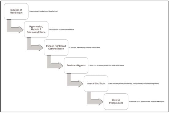 Epoprostenol was initiated at 2 ng/kg/min, with an initial strategy to up-titrate the dosage to approximately 30 ng/kg/min. Subsequent to the initiation of this therapy, the patient exhibited hypotension and experienced rapidly deteriorating hypoxia and pulmonary edema. A repeat RHC indicated pulmonary artery pressures of 70/28/42 mmHg, PCWP of 16 mmHg, PVR of 7 WU, and a CI of 2.4 L/min/m2.