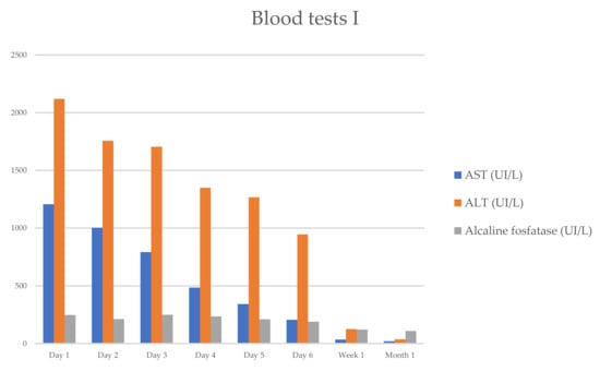 Evolution of serum biochemical assay (AST/ALT/ALP), which has markedly improved within 1 week.