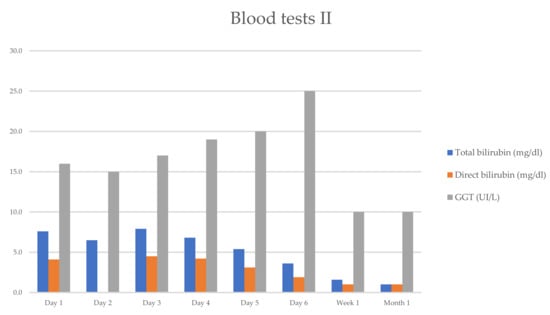 The patient’s complete blood count showed a white blood cell (WBC) count of 11.9 × 103/mL (segmented neutrophils 68.5%, lymphocytes 25%, eosinophil 0.3%), hemoglobin count of 12.3 g/dL, hematocrit count of 31.1%, and platelet count of 368,000/mL. The serum biochemical assay showed the following results: creatinine, 0.46 mg/dL; Na, 139 mEq/L; and K, 4.0 mEq/L. The laboratory results revealed aminotransferase levels higher than 1000 UI/L (ALT-2120 UI/L, AST—1208 UI/L), and higher total bilirubin (TB—7.9 mg/dL), direct bilirubin (DB—4.1 mg/dL), and alkaline phosphatase (ALP—247 UI/L). The changes in the hepatic enzymes reflected a mixed pattern of liver injury (hepatocellular and cholestatic), with a ratio of serum ALT to serum ALP of 4 (between 2 and 5) (Table 1).