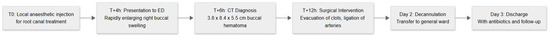 Timeline of the patient’s clinical course. T0 was the time of the local anesthetic injection, and the progression of hematoma is described initially hourly and daily until the discharge of the patient from the hospital.