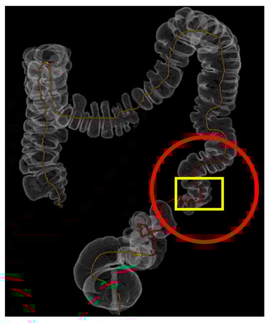 Three-dimensional rendering of CT-colonoscopy: Three-dimensional rendering of CT-colonoscopy (The diverticula are highlighted by red circles, while the stenotic segment is indicated by the yellow box).