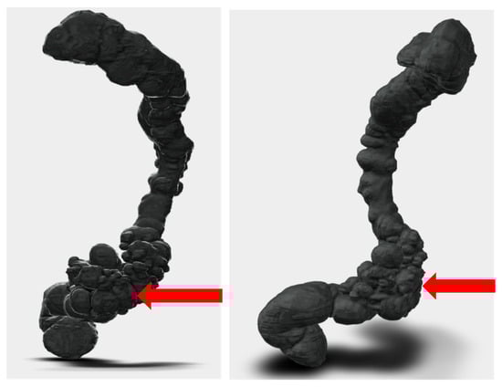 To overcome the limitations of two-dimensional, flat anatomical representations, three-dimensional virtual reconstructions of conventional cross-sectional imaging (MDCT) have been developed with the ultimate goal of facilitating a more detailed understanding [,]. Virtual 3D images can be rotated to obtain various viewing angles, enhancing depth perception and improving spatial orientation. However, virtual 3D models are only accessible via a computer and dedicated software. Additionally, assessing relationships and distances between structures can be challenging, as they strongly depend on the model’s orientation on the screen []. These limitations can be addressed with 3D printing technology, a tool increasingly applied to surgical planning and training. In gastrointestinal surgery more broadly, patient-specific 3D reconstructions support tailored preoperative planning []. This is consistent with recent evidence in colorectal surgery training []. In our case, the 3D reconstruction and printed model were directly integrated into preoperative planning. The model allowed the surgical team to anticipate the need for a left hemicolectomy, mobilization of the splenic flexure, and potential ligation of the inferior mesenteric artery. It was also used to rehearse trocar placement and to anticipate potential vascular dissection, thereby providing the surgical team with a clearer understanding of the intraoperative steps. Importantly, the anatomical features predicted by the model—including the extension of diverticulosis and the presence of a stenotic segment—were confirmed intraoperatively, demonstrating a high anatomical fidelity. Although it was not employed as a full-scale simulation or “dry run,” the model offered practical guidance for structuring the mobilization and resection phases and contributed to a greater surgical confidence. Comparable findings have been reported in clinical applications of 3D printing to a laparoscopic colectomy [].